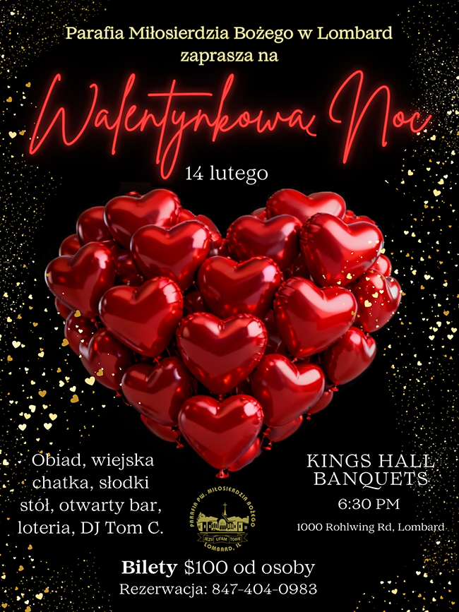 Parafia Miłosierdzia Bożego w Lombard zaprasza na Walentynkową Noc w sobotę, 14 lutego o godz. 6:30 pm do Kings Hall Banquets przy 1000 Rohlwing Rd. w Lombard. Obiad, wiejska chatka, słodki stół, otwarty bar, loteria, DJ Tom C. Bilety: 100 dol. od osoby. Rezerwacja, tel.: (847) 404-0983.