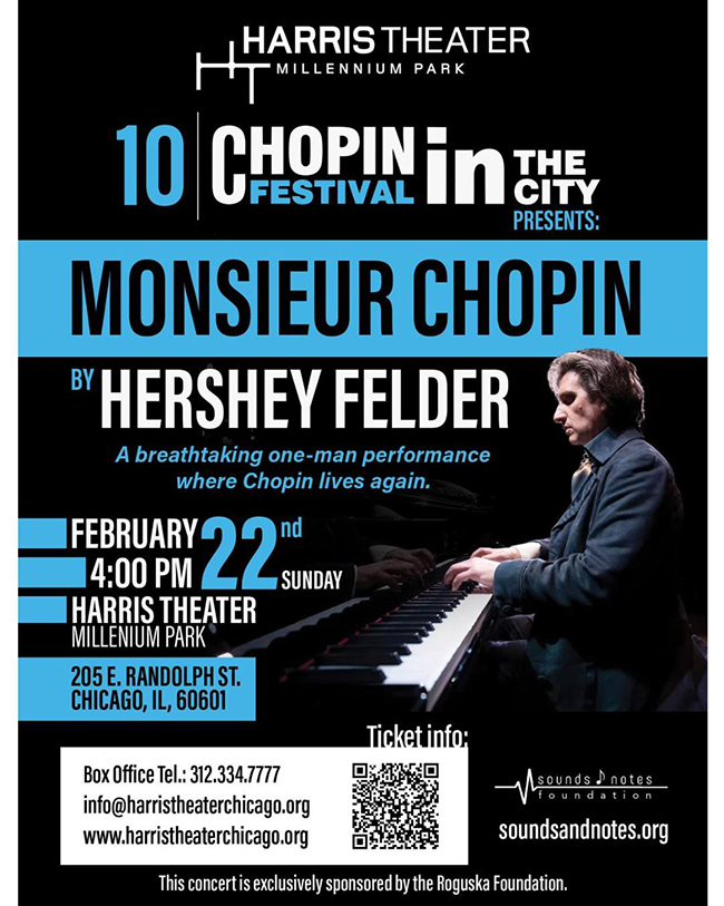 Harris Theater w Millennium Park (205 E. Randolph, Chicago) zaprasza na przedstawienie „Monsieur Chopin” – monodram z muzyką, w niedzielę, 22 lutego 2026 r. o godz. 4 pm. W roli Chopina – Hershey Felder – aktor, pianista i wirtuoz. Bilety: 37,40 – 129,40 dol. Info: http://www.harristheaterchicago.org/performance/monsieur-chopin