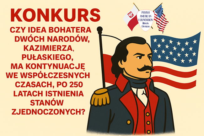 W związku ze zbliżającymi się obchodami Dnia Pułaskiego, Fundacja Polsko-Amerykańska na Stan Illinois organizuje konkurs pisemny adresowany do uczniów szkół polonijnych: klas 7-8 oraz klas licealnych. Temat pracy pisemnej: „Czy idea Bohatera Dwóch Narodów, Kazimierza Pułaskiego, ma kontynuację we współczesnych czasach, po 250 latach istnienia Stanów Zjednoczonych?”. Zasady konkursu: praca pisemna powinna być napisana w języku polskim lub angielskim; w konkursie mogą uczestniczyć uczniowie klas 7-8 oraz licealnych; pisemne prace musza zawierać minimum 300 słów.