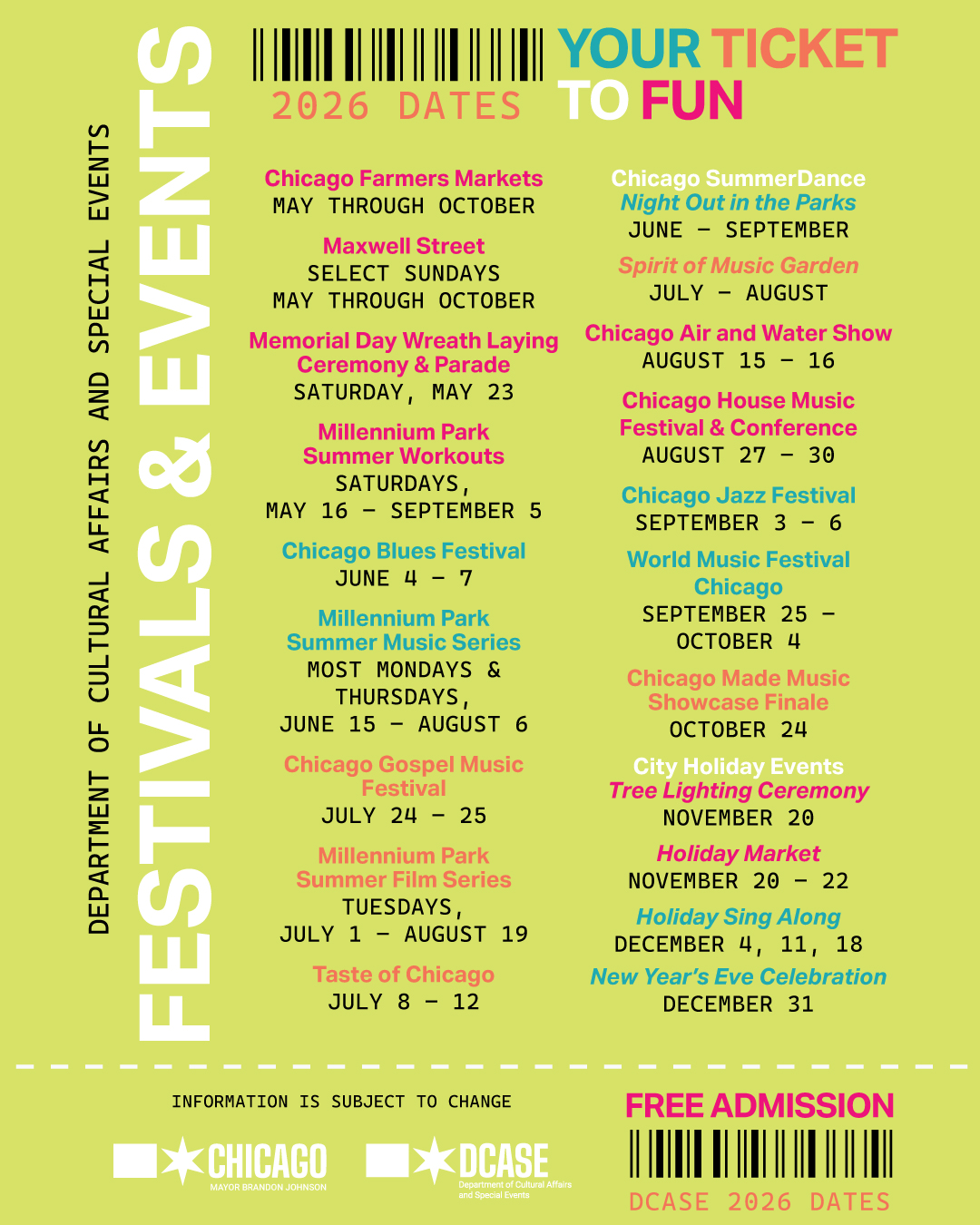 Grant Park Music Festival, edycja 2026, rozpocznie się 10 czerwca i potrwa do 15 sierpnia. Koncerty odbywać się będą głównie w Jay Pritzker Pavilion w Parku Milenijnym, ale także w Harris Theater i South Shore Cultural Center. Początek o godz. 6:30 pm oraz 7:30 pm. Wstęp wolny. W programie: