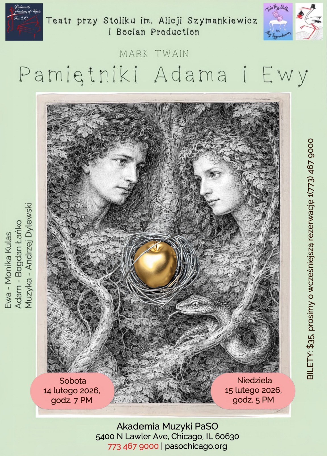 Sztuka „Pamiętniki Adama i Ewy” Marka Twaina to pełna humoru, ponadczasowa opowieść o tym, jak mogły wyglądać początki znajomości pierwszej kobiety z pierwszym mężczyzną na Ziemi. W roli Ewy- Monika Kulas, Adama- Bogdan Łańko. Muzyka – Andrzej Dylewski. Teatr przy Stoliku im. Alicji Szymankiewicz i Bocian Production serdecznie zapraszają na dwa spektakle: w sobotę, 14 lutego, o godz. 7 pm i w niedzielę, 15 lutego o godz. 5 pm, do Akademi Muzyki PaSO – Sala Koncertowa im. dr Roguskiej-Kyts przy 5400 N. Lawler Ave. w Chicago. Bilety: 35 dol. Uprzejmie prosimy o wcześniejszą rezerwację pod nr. tel.: (773) 467 9000. Info: https://www.facebook.com/share/p/1BwVYRMoSM/