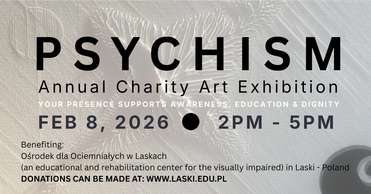 Psychizm – wernisaż charytatywny dr Błażeja Łojewskiego na rzecz Towarzystwa Opieki nad Ociemniałymi w Laskach odbędzie się w niedzielę, 28 lutego w godz. 2-5 pm w Dwell Studio Chicago przy 7449 W. Irving Park Rd. Informacje: https://www.dwellstudiochicago.com/s/stories/psychism-annual-charity-art-exhibition