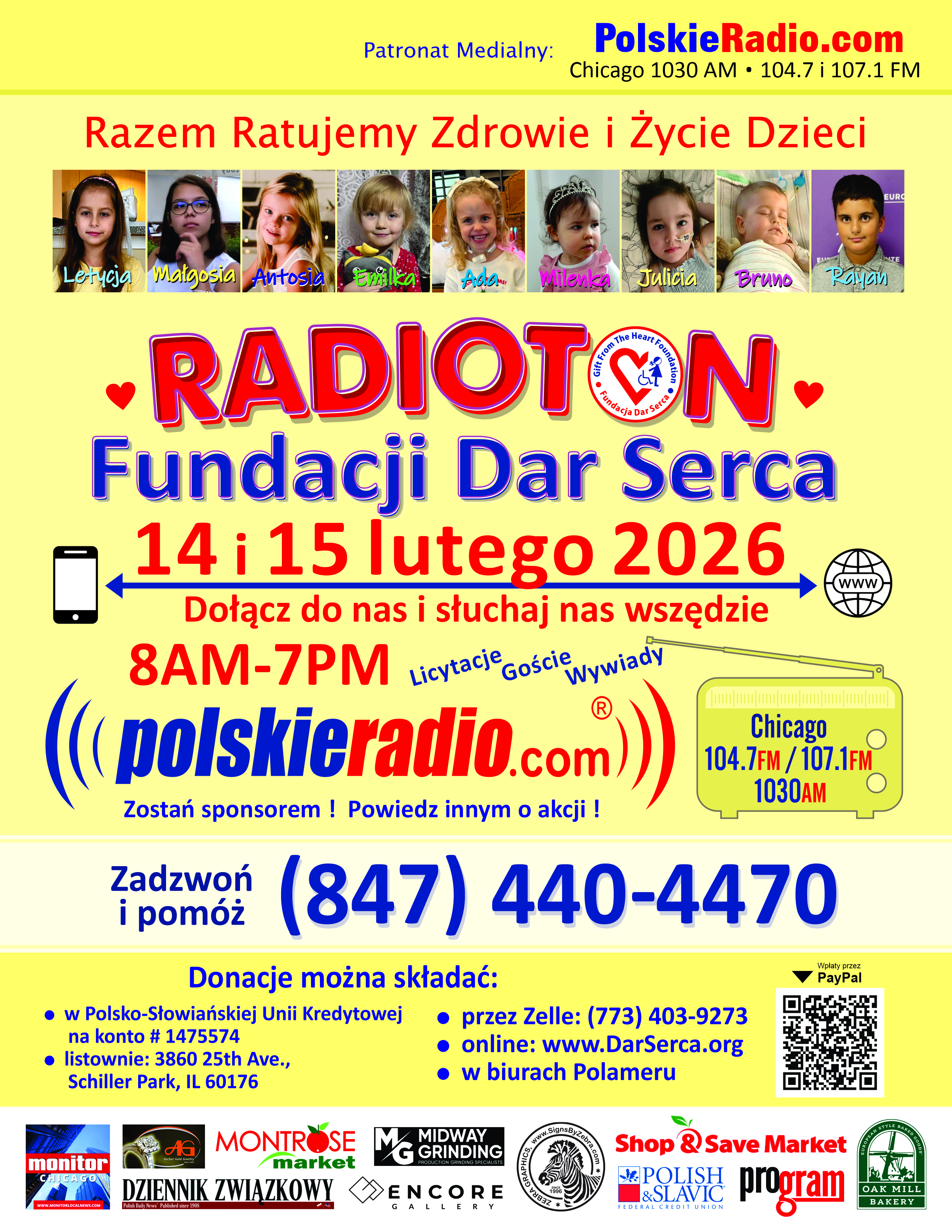 Fundacja Dar Serca zaprasza do udziału w charytatywnym Radiotonie w sobotę i niedzielę, 14-15 lutego w godz. 8 am – 7 pm na antenie polskieradio.com, 1030AM, 104.7FM oraz 107.1FM. Zadzwoń i pomóż: (847) 440-4470. Info: darserca.org