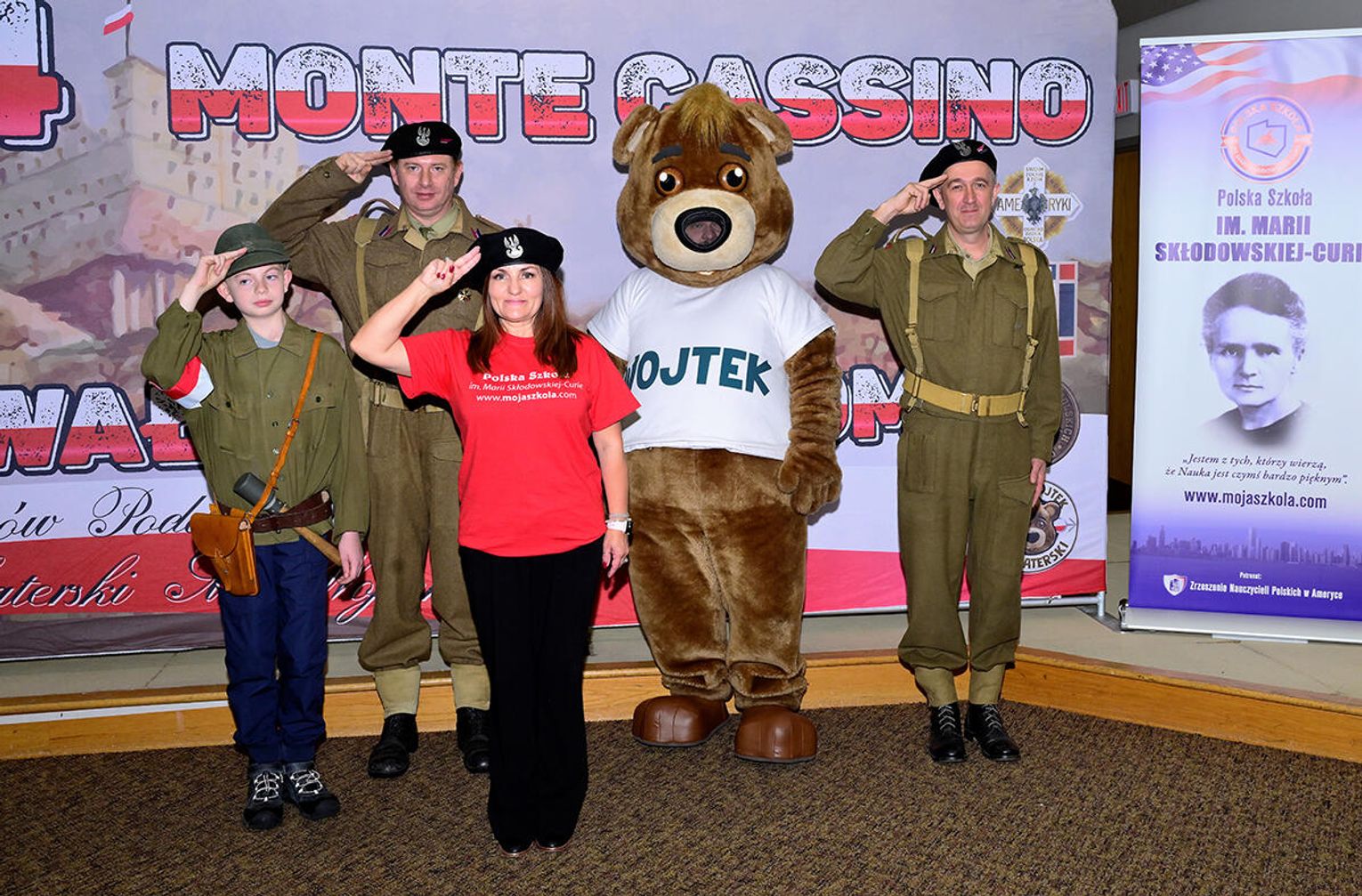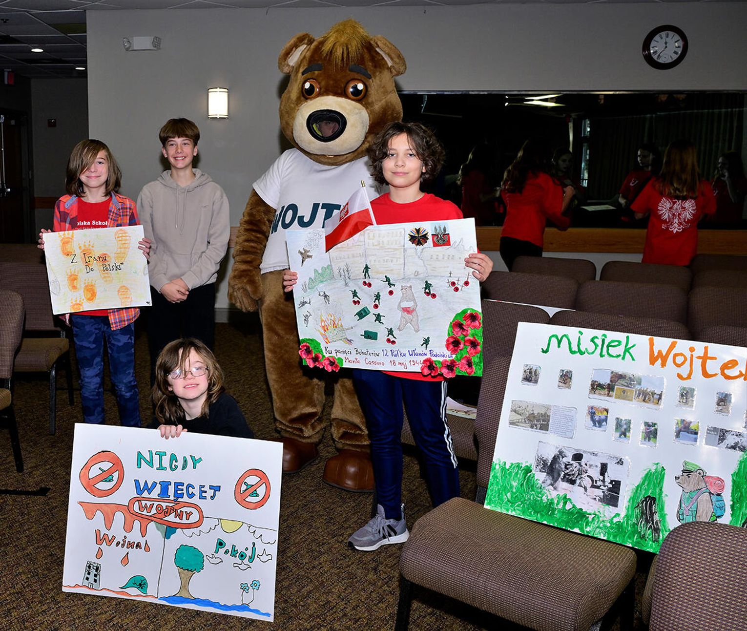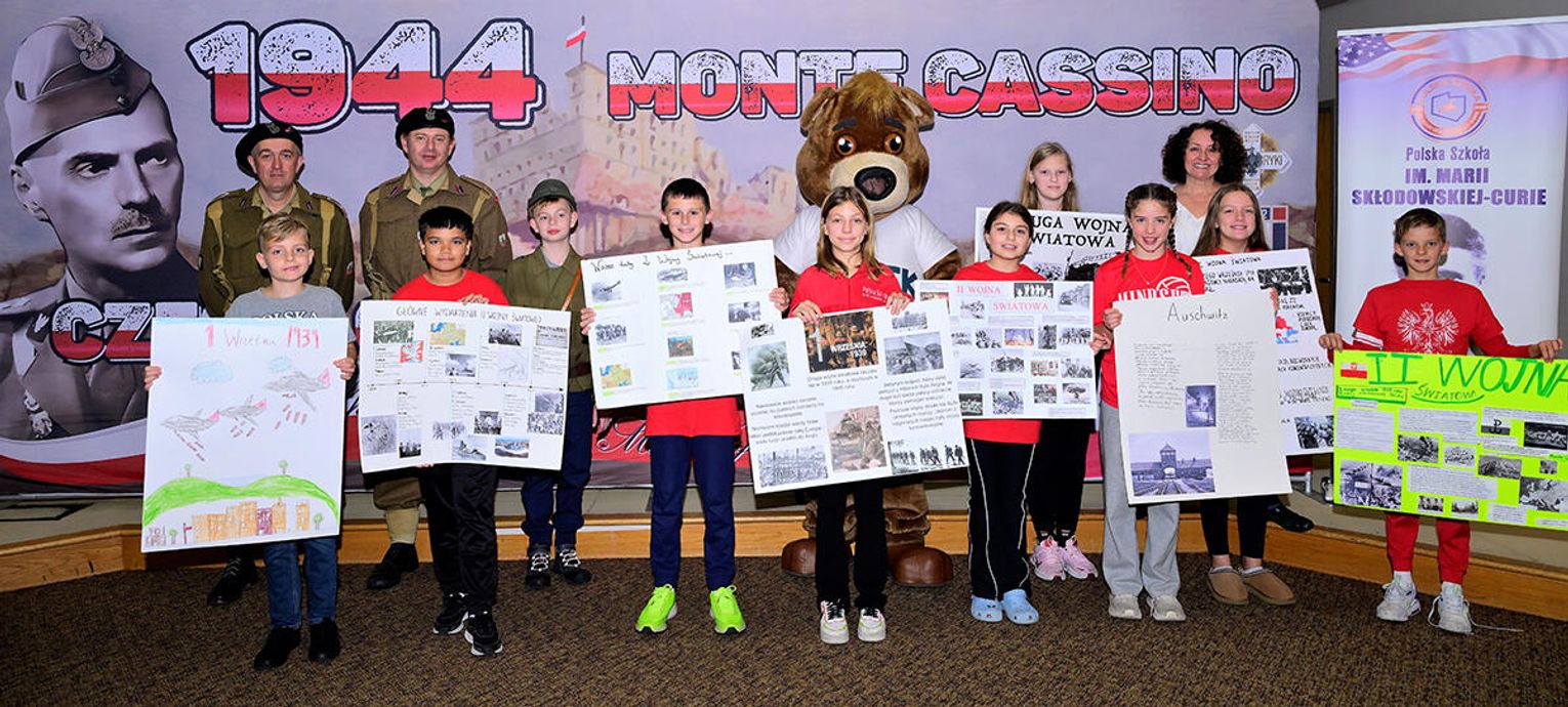 Uczniowie pod kierunkiem nauczycieli starannie przygotowali się do tej wizyty, bo przecież i goście byli wyjątkowi! Najmłodsi wychowankowie naszej szkoły wykonali portrety Misia Wojtka, które osobiście wręczyli z wypiekami na twarzach, co poniektórzy odważnie klepiąc Misia po brzuszku lub przybijając piątkę. Starsze klasy, wykonały plakaty nawiązujące swoją tematyką do wydarzeń związanych z walkami na frontach II wojny światowej lub do szeroko pojętych polskich dróg do wolności. Na pracach mogliśmy więc dostrzec sławne Wzgórze pod Monte Cassino, były sceny batalistyczne, historie zawiązane z Pestkami czyli kobietami – ochotniczkami walczącymi ramię w ramię z mężczyznami oraz hasła „Nigdy więcej wojny!”. Jakże szczególnie w dzisiejszej rzeczywistości brzmi to wołanie młodych ludzi!