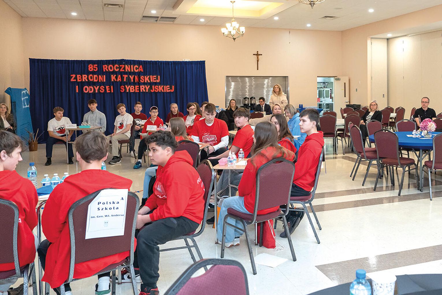 Do wyjątkowo trudnego, ale jak ważnego zagadnieniem przygotowali się uczniowie: Polskiej Szkoły im. Gen. Andersa, Polskiej Szkoły im. M. Kopernika, Polskiej Szkoły im. Bł. Brata Chmielowskiego, Polskiej Szkoły im. J. Karskiego, Polskiej Szkoły Językowej im. F. Konarskiego. Pani Dyrektor Renata Rudnicki powitała gości cytatem z „Mazepy” Juliusza Słowackiego: „Ze wszystkich nędz najstraszniejsze ludzkie zapomnienie”, zapewniając tym samym, że dzieci i młodzież polonijna pamiętają o trudnych wydarzeniach z kart polskiej historii. Spotkanie rozpoczęto wniesieniem przez uczniów szkoły zapalonego znicza, który tlił się przy krzyżu z drzewa brzozy. W ten wzruszający sposób upamiętniono ofiary katyńskie i nieludzkiej ziemi syberyjskiej.