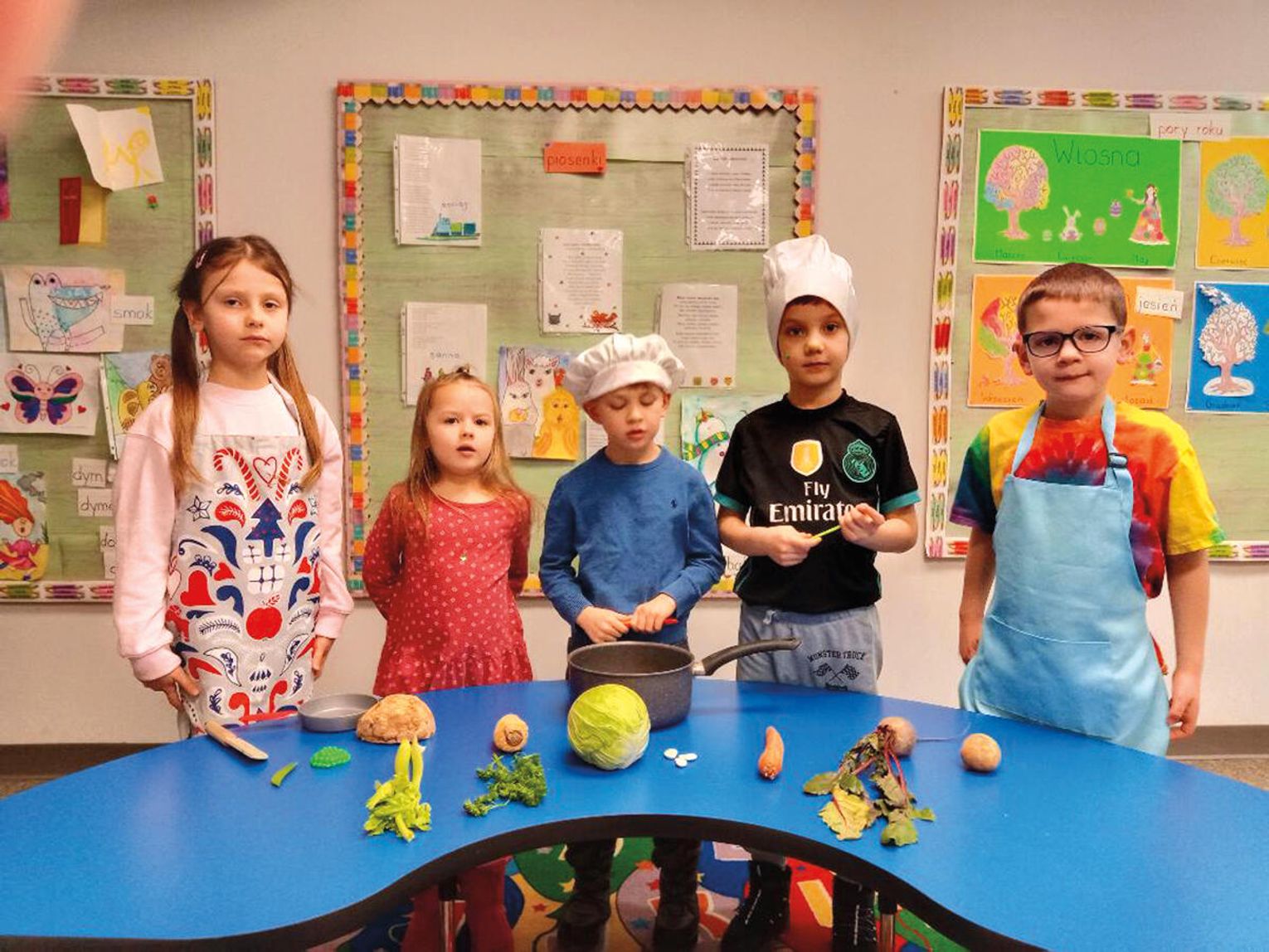 W tym samym dniu zerówkowicze popisali się wiedzą o warzywach i umiejętnościami recytatorskimi. W strojach kucharskich zaprezentowali wiersz Juliana Tuwima zatytułowany „Warzywa”. Zwycięzcami konkursu zostali: Ola Mikos, Ruby Suski, Adrian Fryda, Sebastian Wrobel, Henry Brownewell i Gabriel Slomski. Ich artystyczny występ można obejrzeć na szkolnym Facebooku. Gratulujemy młodym artystom!