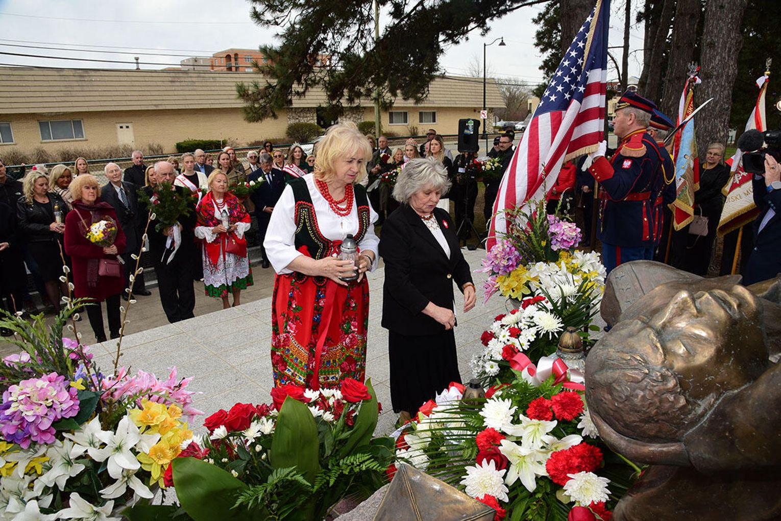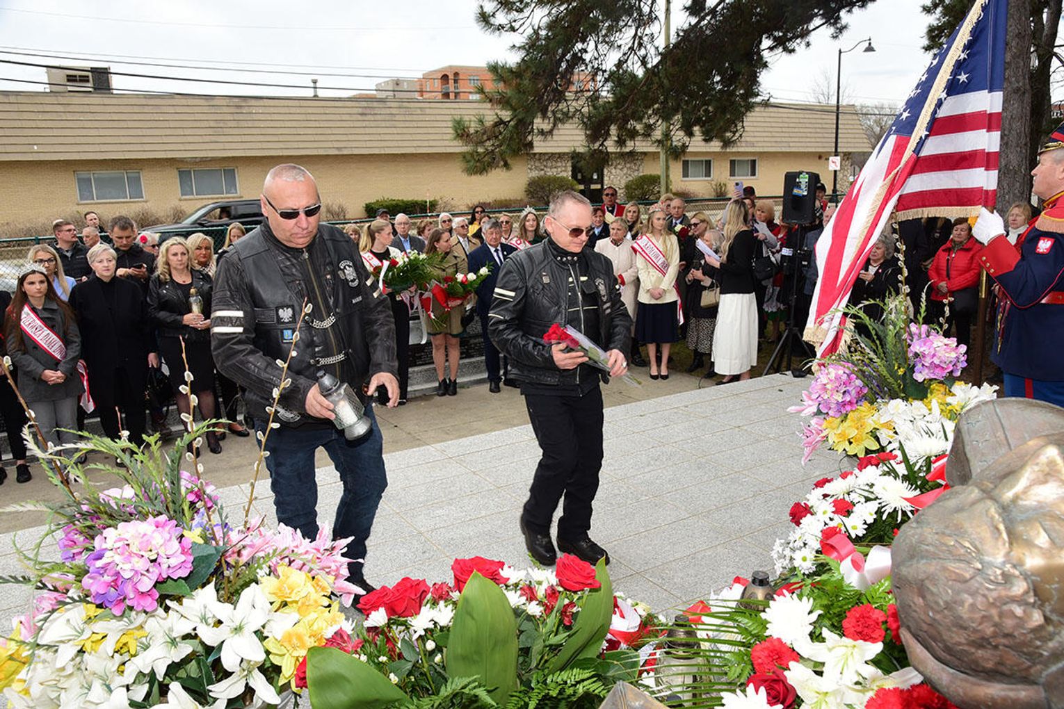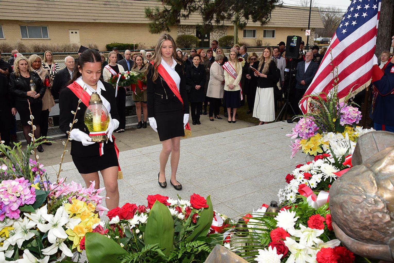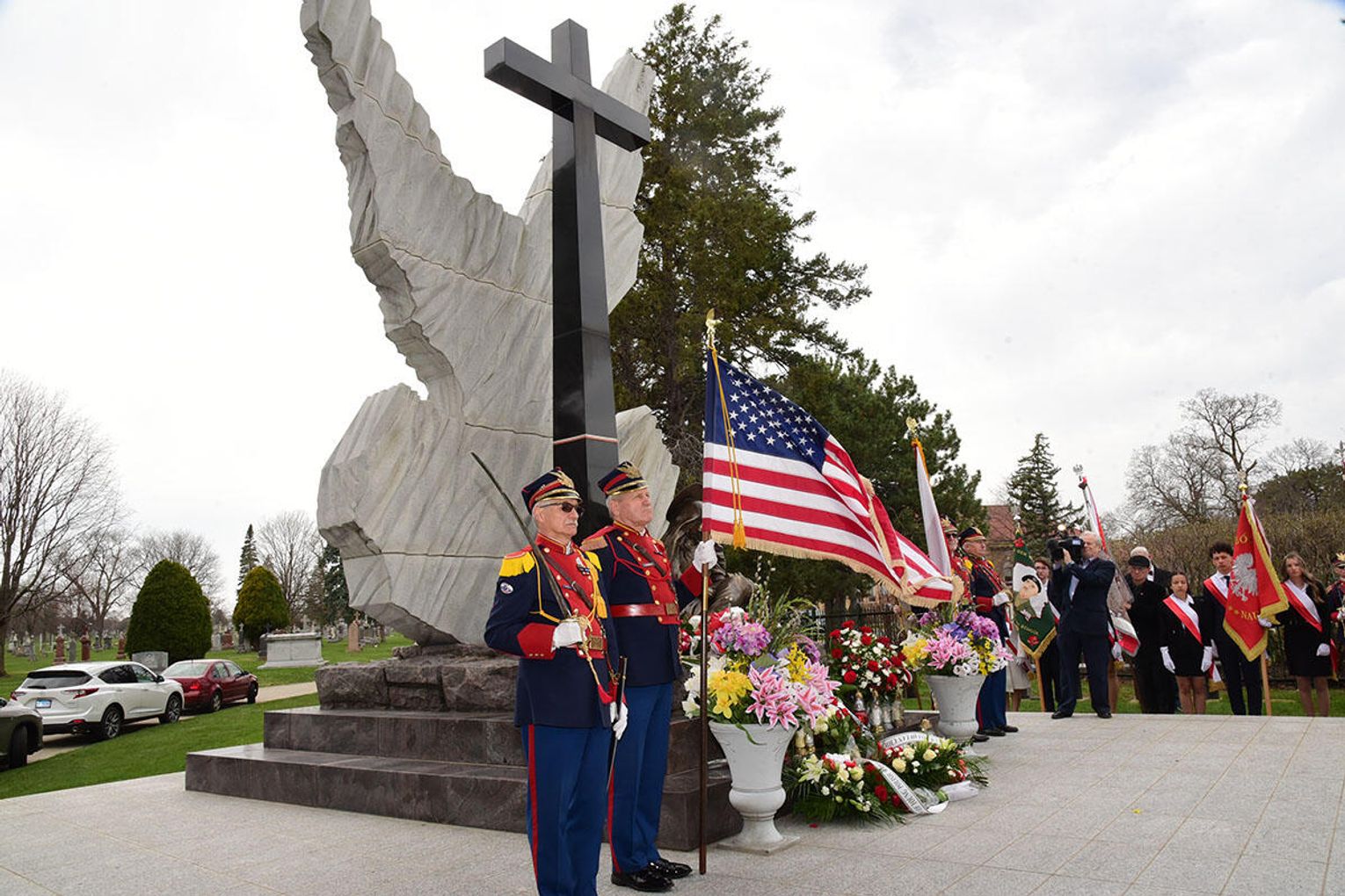 Po wspólnej modlitwie historię tragicznych wydarzeń w okolicznościowym programie przypomnieli Alina Szymczyk i Jan Żółtek ze Zrzeszenia Literatów Polskich im. św. Jana Pawła II. Następnie członkowie delegacji złożyli wieńce i zapalili znicze. W imieniu władz Rzeczypospolitej Polskiej kwiaty złożyła konsul generalna Regina Jurkowska. W kolejnych odsłonach tej ceremonii kwiaty składały delegacje reprezentujące: Związek Klubów Polskich, Polsko-Słowiańską Federalną Unię Kredytową, Zrzeszenie Literatów Polskich im. św. Jana Pawła II, Klub Pojawie, Zrzeszenie Nauczycieli Polskich w Ameryce, Przystanek Historia Instytutu Pamięci Narodowej w Chicago, Klub Przybysławice, Stowarzyszenie Rajd Katyński „Pamięć i Tożsamość”, Polska Szkoła im. Gen. Władysława Andersa, Klub Motocyklowy „Wataha Rider”, Polska Szkoła im. Św. Brata Alberta Chmielowskiego, Legion Młodych Polek, Klub Przyjaciół Miasta Stalowa Wola w Chicago, Chicago Society, Związek Harcerstwa Polskiego, Ruch Obywatelski „Patria Polonia” oraz Anna Wójtowicz, córka śp. Wojciecha Seweryna, twórcy Pomnika Katyńskiego, który zginął w katastrofie smoleńskiej w drodze do Katynia na obchody 70. rocznicy mordu katyńskiego.