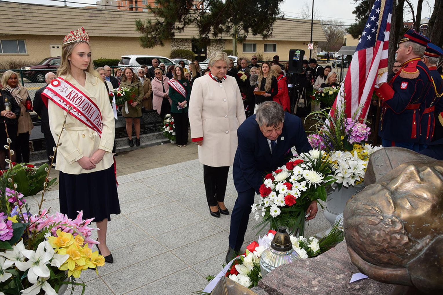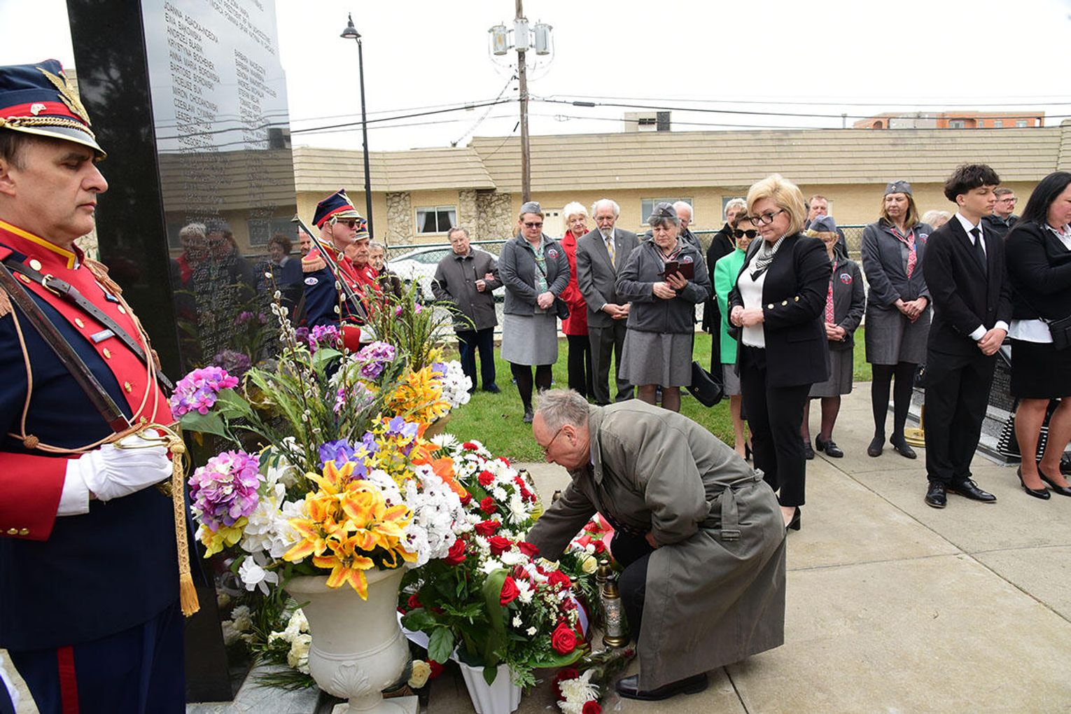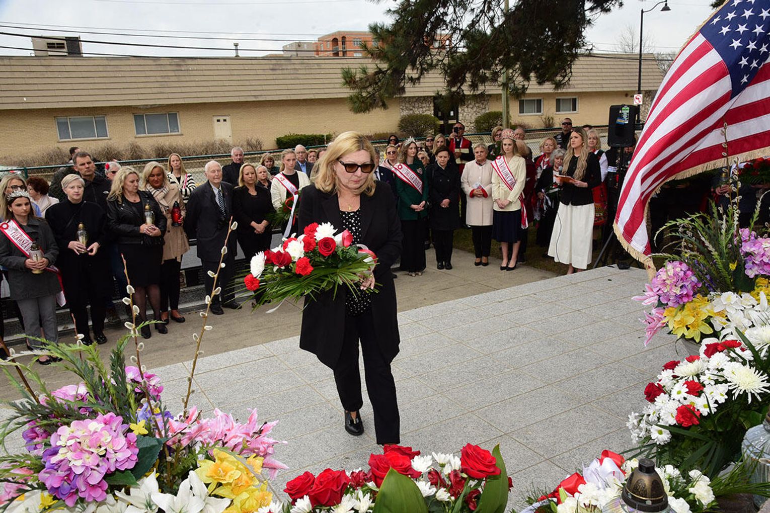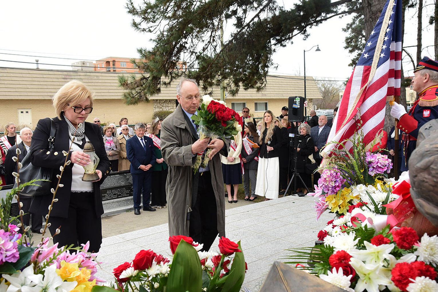 Po wspólnej modlitwie historię tragicznych wydarzeń w okolicznościowym programie przypomnieli Alina Szymczyk i Jan Żółtek ze Zrzeszenia Literatów Polskich im. św. Jana Pawła II. Następnie członkowie delegacji złożyli wieńce i zapalili znicze. W imieniu władz Rzeczypospolitej Polskiej kwiaty złożyła konsul generalna Regina Jurkowska. W kolejnych odsłonach tej ceremonii kwiaty składały delegacje reprezentujące: Związek Klubów Polskich, Polsko-Słowiańską Federalną Unię Kredytową, Zrzeszenie Literatów Polskich im. św. Jana Pawła II, Klub Pojawie, Zrzeszenie Nauczycieli Polskich w Ameryce, Przystanek Historia Instytutu Pamięci Narodowej w Chicago, Klub Przybysławice, Stowarzyszenie Rajd Katyński „Pamięć i Tożsamość”, Polska Szkoła im. Gen. Władysława Andersa, Klub Motocyklowy „Wataha Rider”, Polska Szkoła im. Św. Brata Alberta Chmielowskiego, Legion Młodych Polek, Klub Przyjaciół Miasta Stalowa Wola w Chicago, Chicago Society, Związek Harcerstwa Polskiego, Ruch Obywatelski „Patria Polonia” oraz Anna Wójtowicz, córka śp. Wojciecha Seweryna, twórcy Pomnika Katyńskiego, który zginął w katastrofie smoleńskiej w drodze do Katynia na obchody 70. rocznicy mordu katyńskiego.
