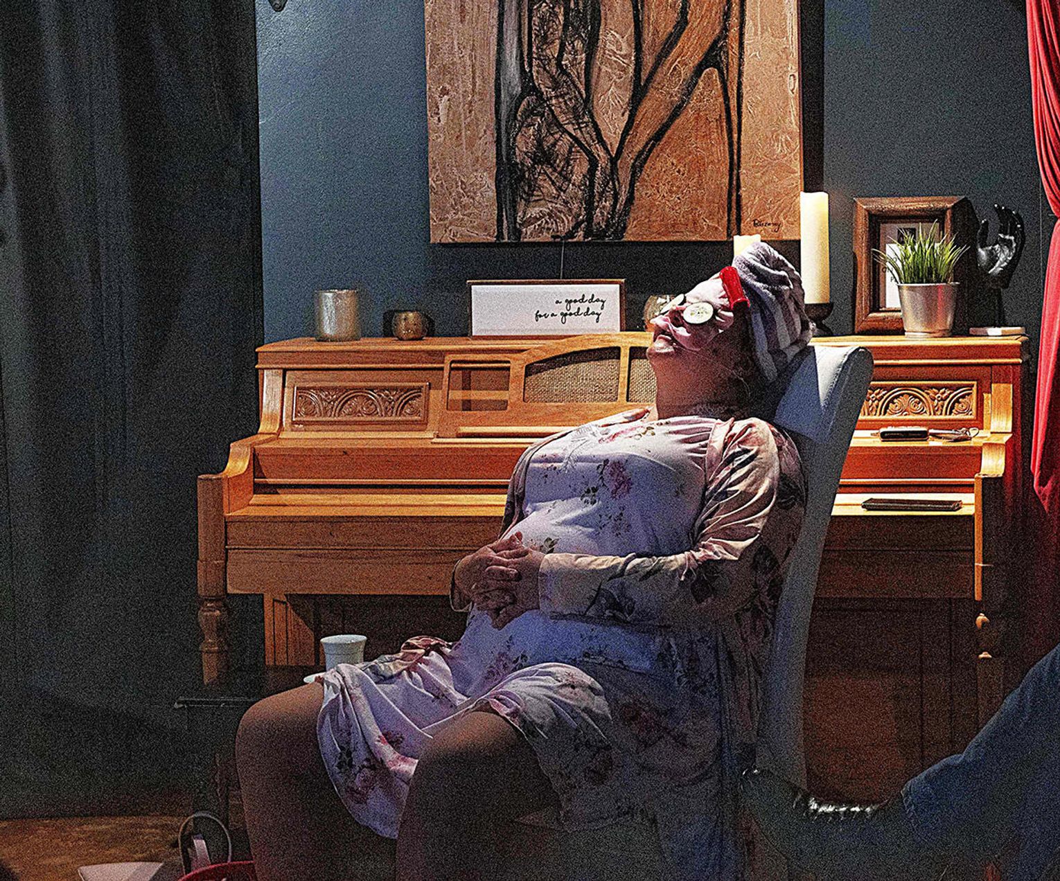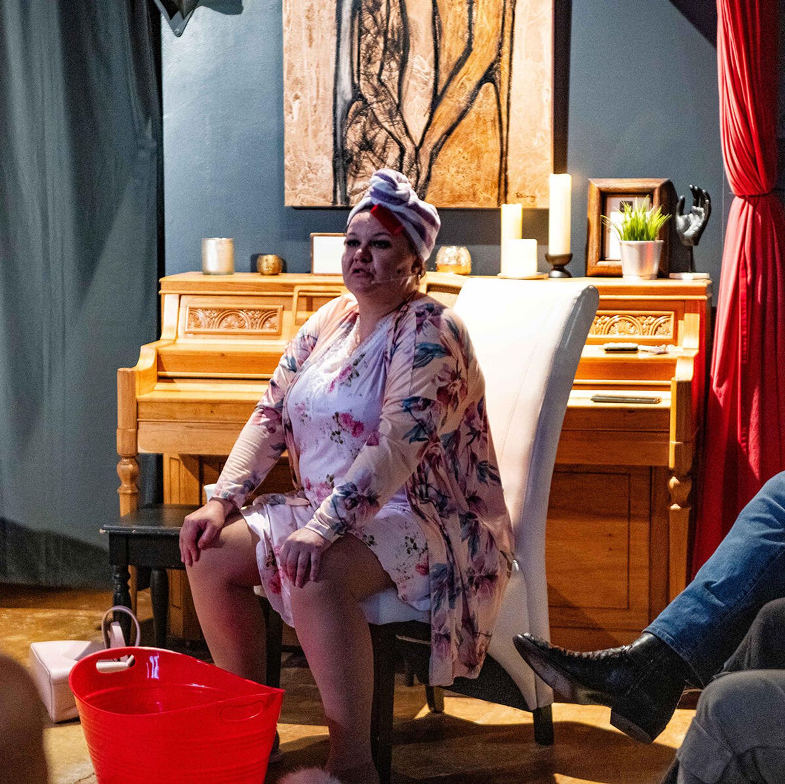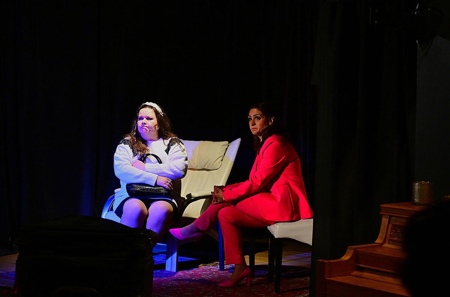 Aldona Olchowska w roli żony, Apolonii, jest władcza, ekspansywna, nie znosi sprzeciwu, a jeżeli idzie na ustępstwa to tylko na takie, które przyniosą jej korzyść. Kiedy w poczekalni poradni małżeńskiej zauważa tłum oczekujących tam pacjentów-widzów, to skutecznie przekonuje wszystkich, że jej problem jest najważniejszy i że nie będzie oczekiwała w poradnianym ogonku.. Aldona nie jest stereotypową zmysłową tancerką, ale mimo to podejmuje próbę uwiedzenia męża, prezentując seksowny taniec. Jej ruchy są pełne energii, kobiecości i temperamentu i chociaż nie robią na małżonku wrażenia, to wywołują aplauz widowni.,