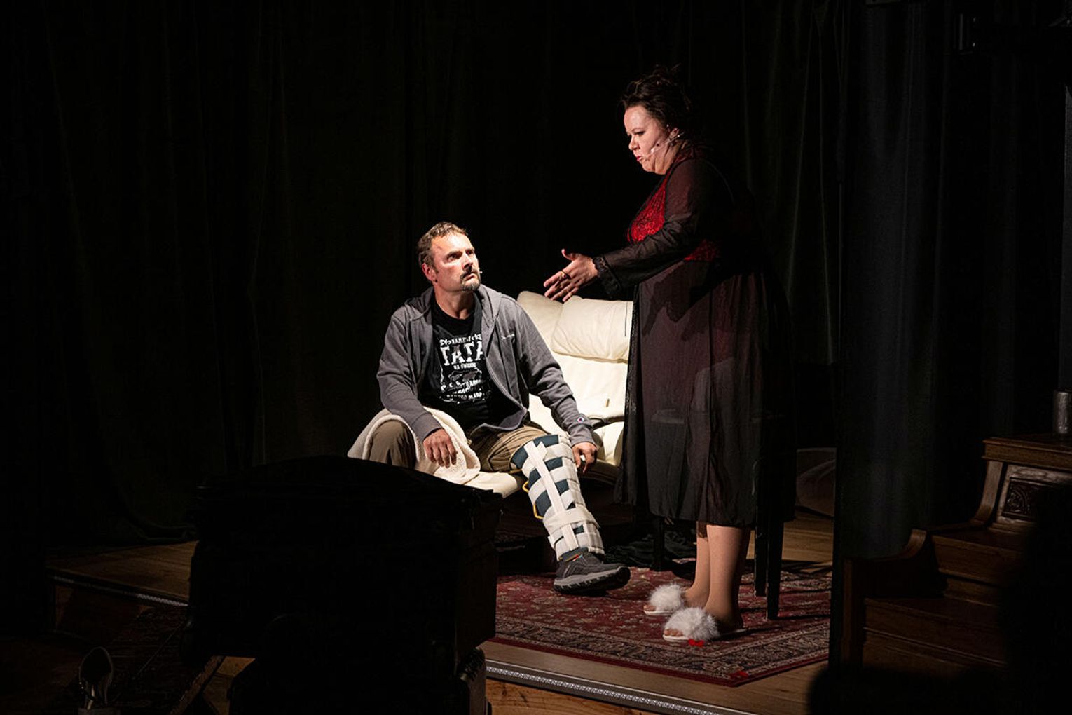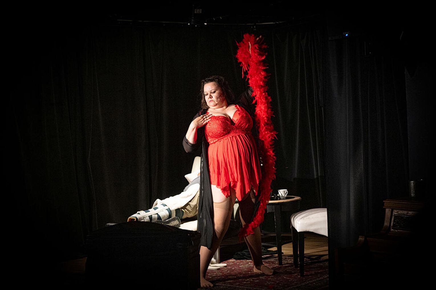 Opisując spektakl nie można wspomnieć o scenografii autorstwa Małgorzaty Duch – minimalistyczna oprawa, stonowana paleta barw oraz oszczędność użytych środków tworzą atmosferę klaustrofobii i potęgują napięcie na scenie.. Walizy, towarzyszące głównemu bohaterowi, podkreślają tymczasowy charakter i ulotność zdarzeń, które są jego udziałem.