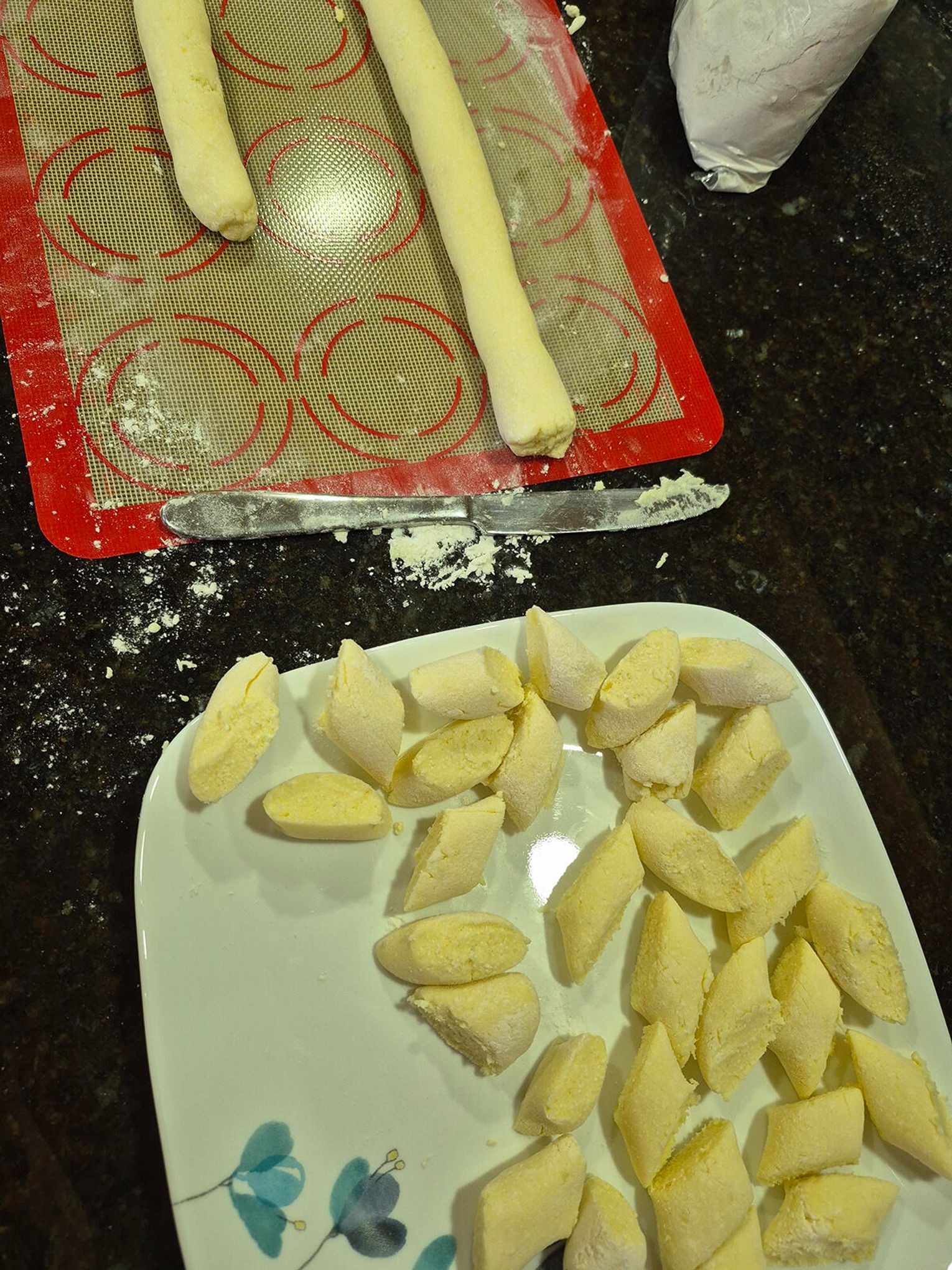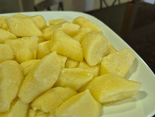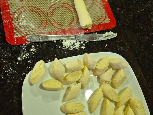 Stopniowo dodawaj mąkę, mieszając do uzyskania miękkiego, lekko klejącego się ciasta. Nie zagniataj zbyt długo. Oprósz stolnicę mąką. Podziel ciasto na 2-3 części. Z każdej uformuj wałek o grubości 2-3 cm. Delikatnie spłaszcz wałek i pokrój ukośnie na małe kluski.