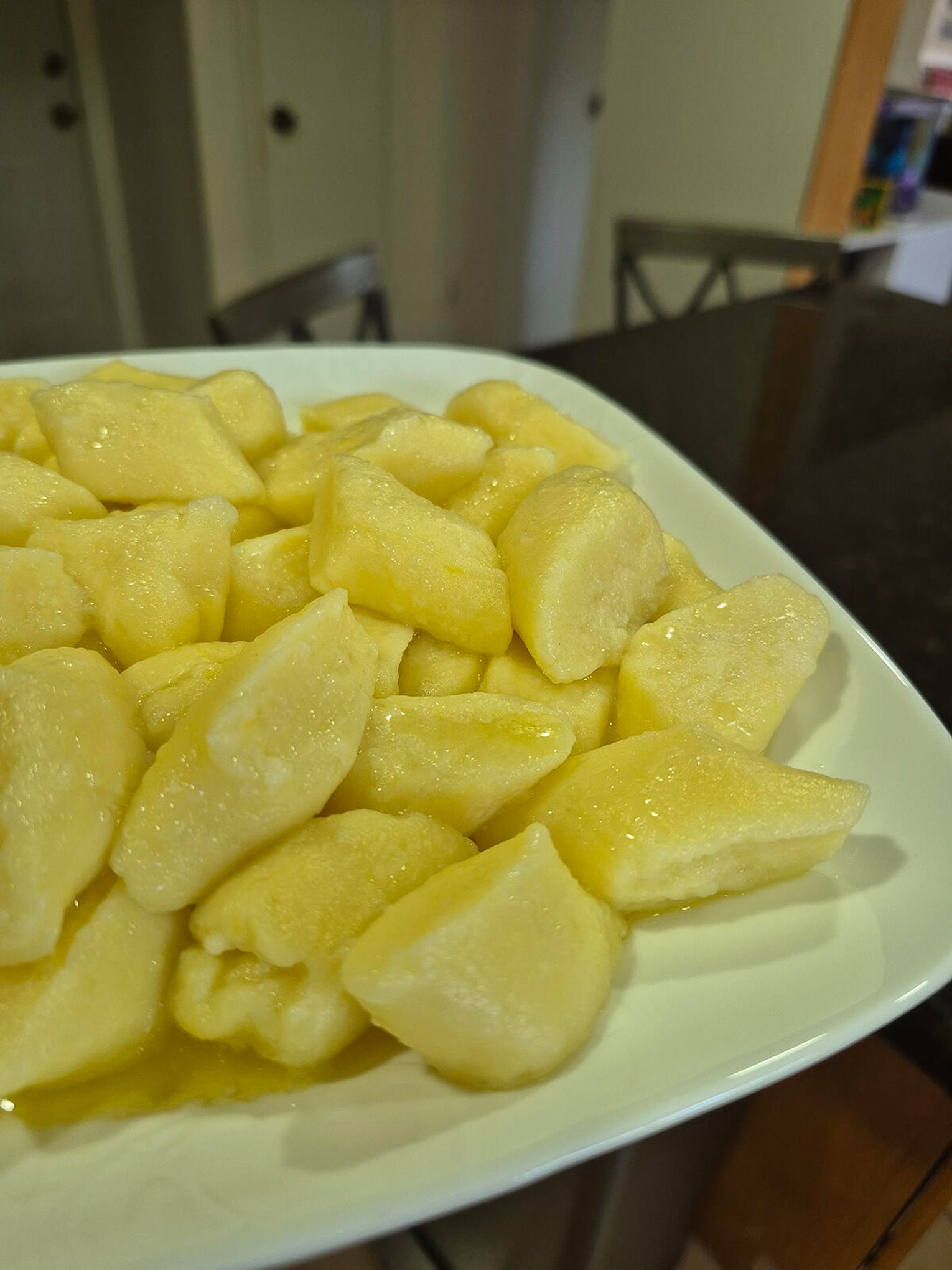 Zagotuj dużą ilość osolonej wody. Wrzucaj kluski partiami. Zamieszaj delikatnie, aby się nie przykleiły. Gotuj 1-2 minuty od momentu wypłynięcia na powierzchnię, a następnie wyjmij łyżką cedzakową.