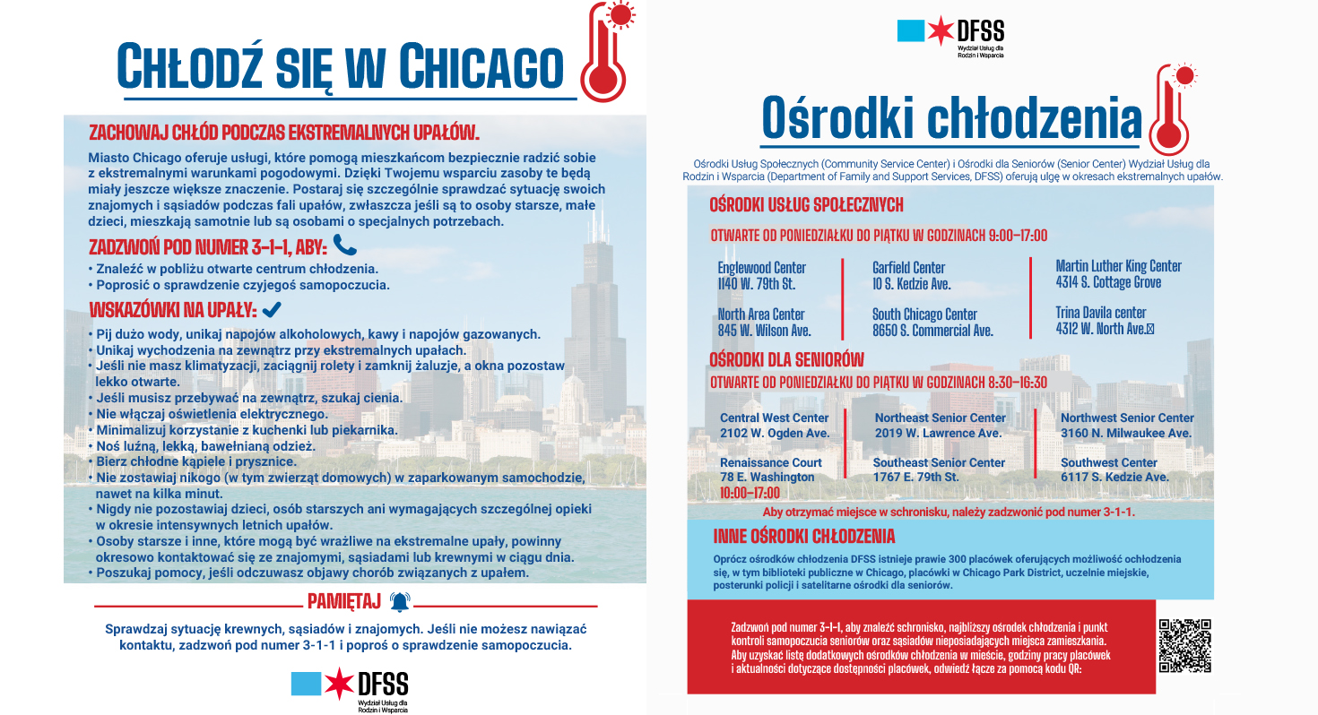 Miasto udostępnia również punkty chłodzenia (cooling centers), gdzie można schronić się przed upałem – ich lista oraz broszura informacyjna, również w języku polskim, dostępna jest na miejskiej stronie: