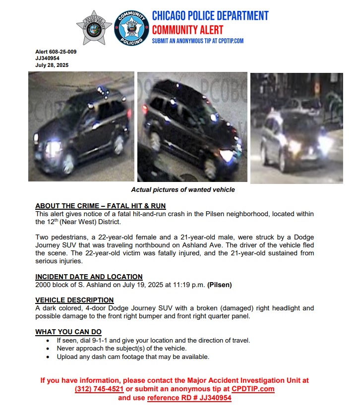 Policja ustaliła, że sprawca poruszał się SUV-em marki Dodge Journey, jadąc w kierunku północnym Ashland Avenue. W komunikacie opublikowanym 28 lipca zamieszczono zdjęcia pojazdu, który może mieć uszkodzony prawy reflektor oraz przednią część po prawej stronie.