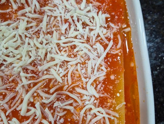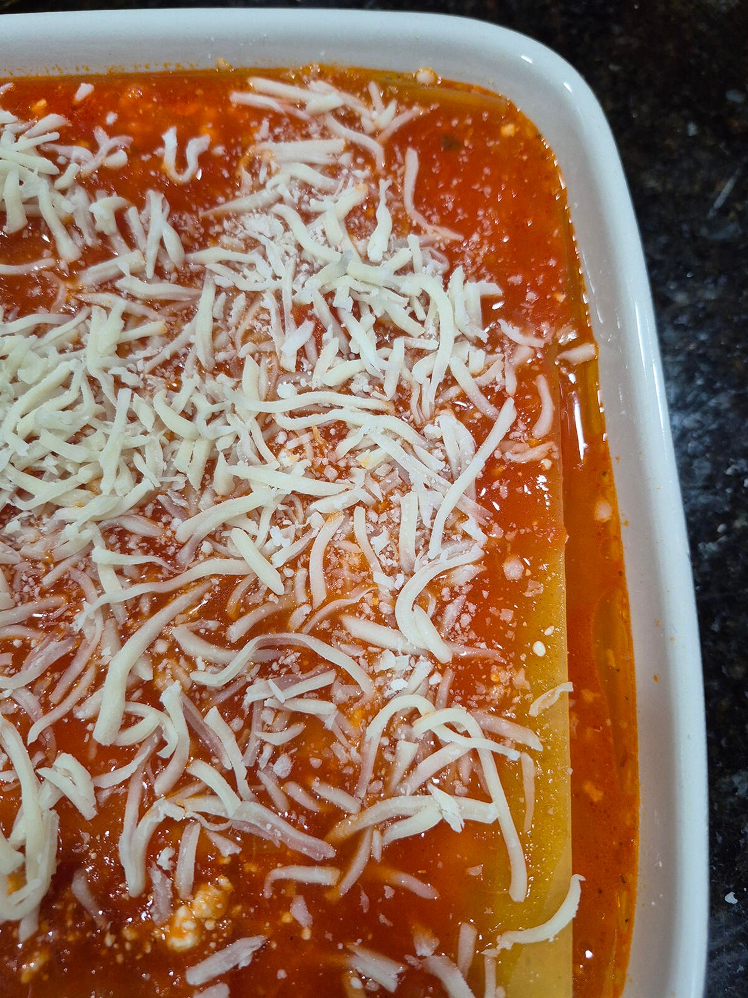 Przykryj folią aluminiową i piecz w temperaturze 380 st. F – 190 st. C przez 30 minut. Zdejmij folię i piecz jeszcze 10-15 minut, aż ser się zarumieni. Odstaw na 10-15 minut przed pokrojeniem. Można udekorować świeżą natką pietruszki lub bazylią.