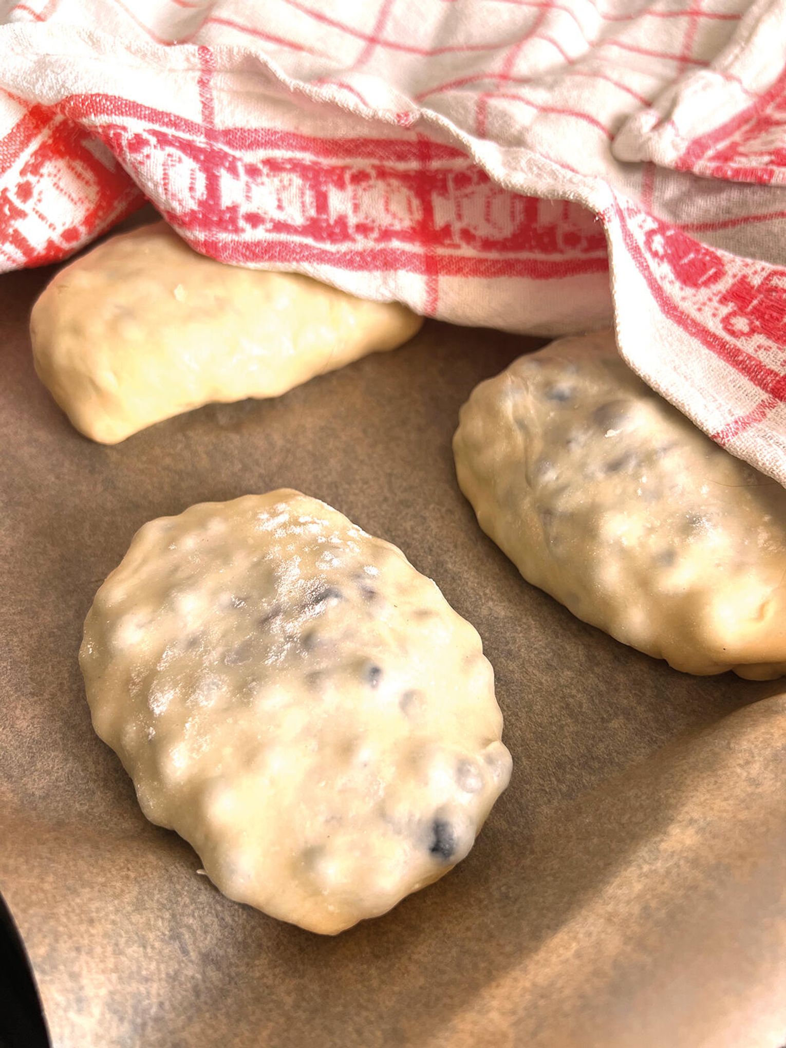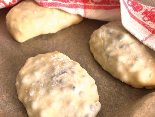 Wyrośnięte ciasto krótko zagnieć i podziel na 8 części. Każdy kawałek rozwałkuj na placek, włóż go do niewielkiej miseczki (w ten sposób łatwiej nadziewać jagodzianki). Nałóż sporą porcję jagód i zlep dokładnie brzegi, formując bułeczki. Układaj je zlepieniem do dołu na blasze wyłożonej papierem do pieczenia, zachowując odstępy. Przykryj i odstaw na 15-20 minut do napuszenia.
