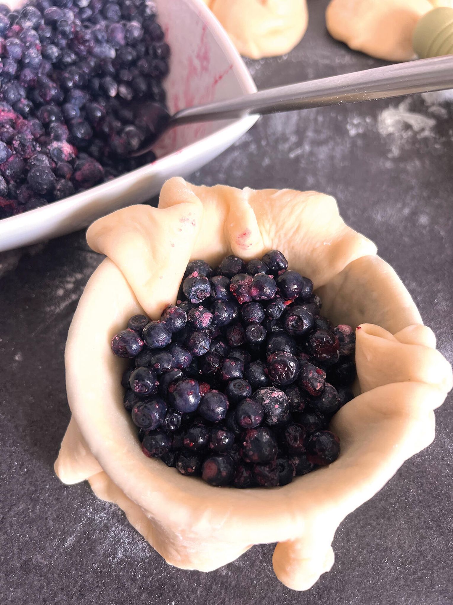 Przygotuj nadzienie jagodowe – w misce wymieszaj jagody z cukrem i skrobią ziemniaczaną. Rób to delikatnie, żeby owoce nie puściły soku.