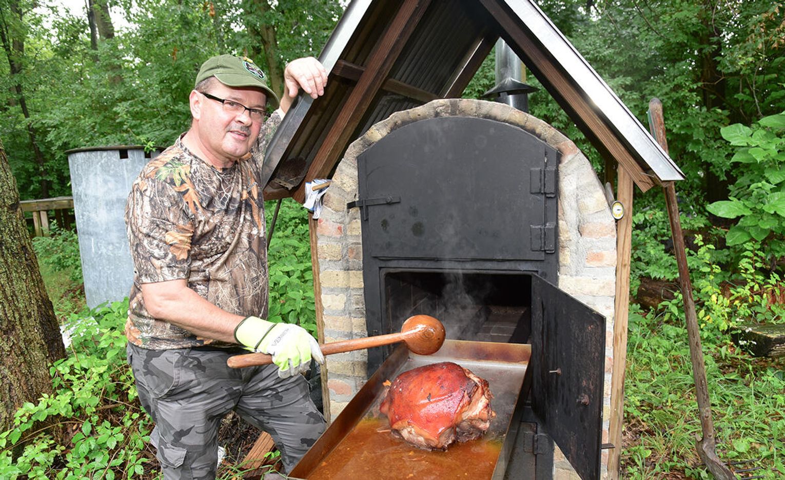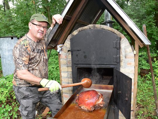 – Przygotowanie szynki do pieczenia wymaga kilku dni. Najpierw trzeba przygotować zalewę, w której cała szynka jest moczona, a później trafia do wykonanego z cegły szamotowej specjalnego pieca, w którym podlega obróbce cieplnej. Co pewien czas trzeba ją podlewać, najlepiej czerwonym winem. Po 5 godzinach jest gotowa do spożycia. Smakuje, że palce lizać – powiedział kuchmistrz Stanisław Kurpaska. Sprawdziłem smak bigosu i pieczystego, faktycznie palce lizać.