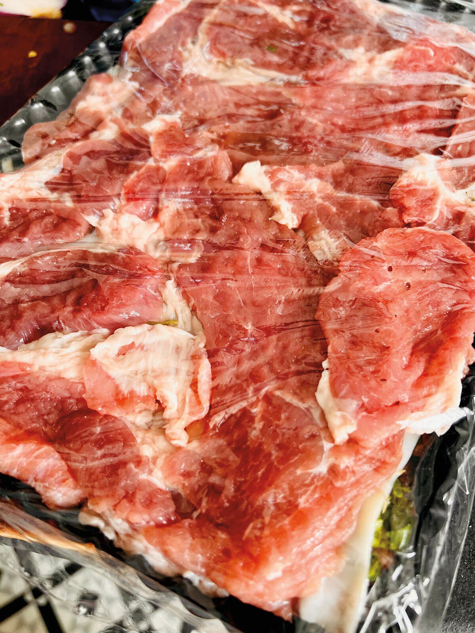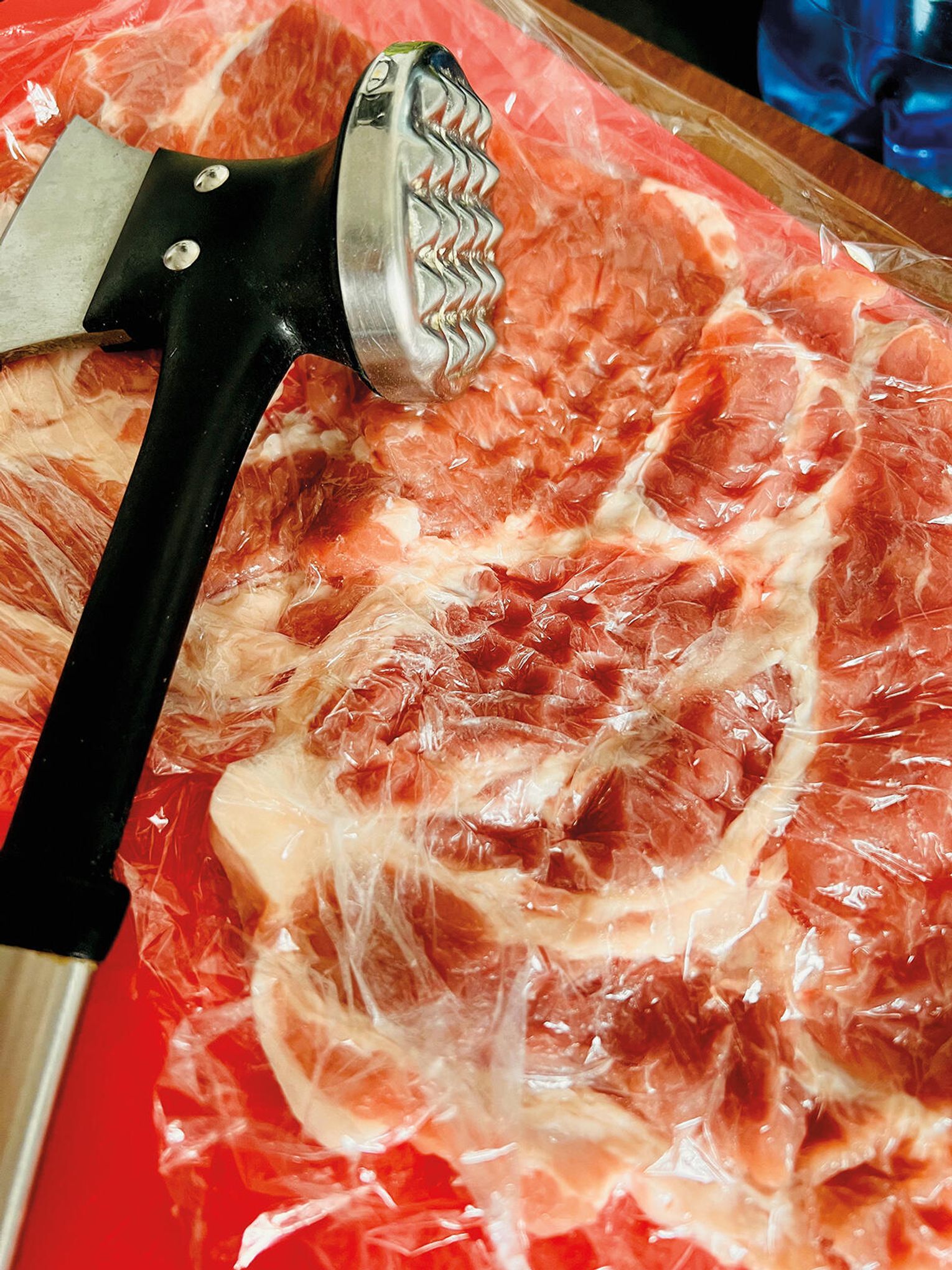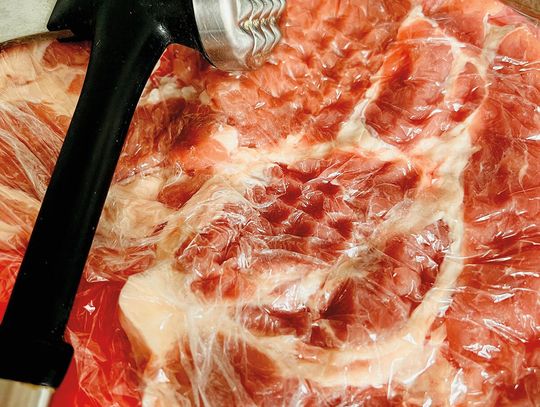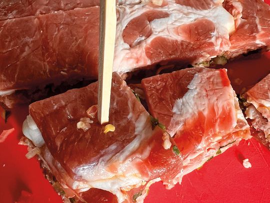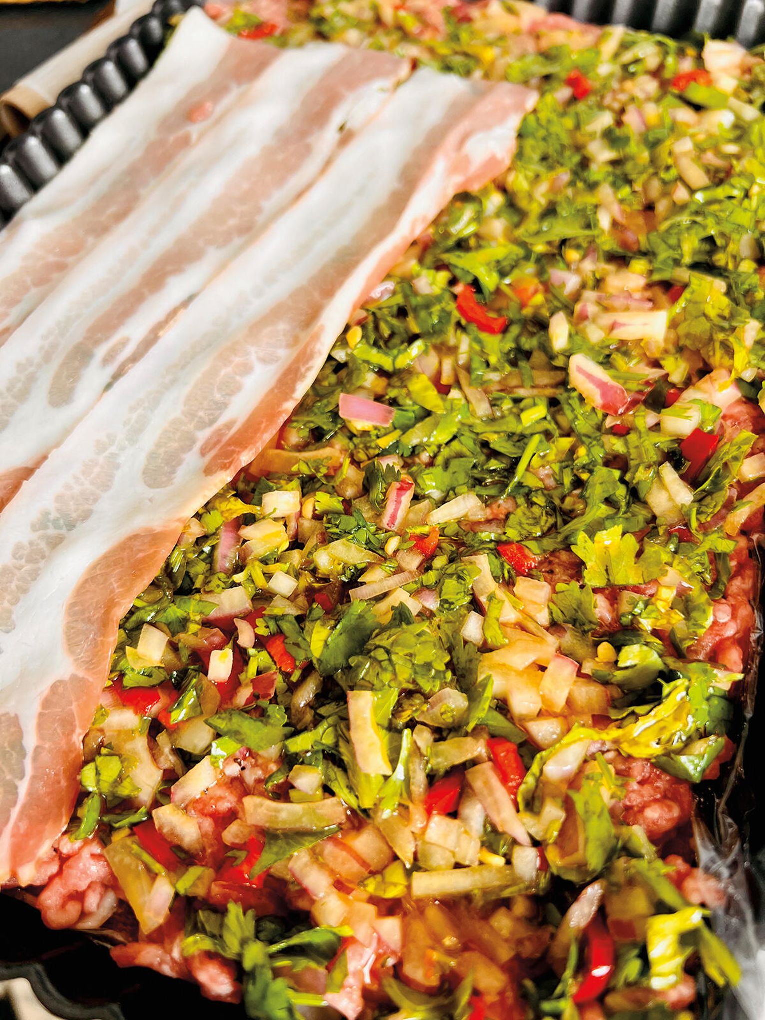 Najpierw przygotuj formę o wymiarach 8×12 cali i wyłóż ją folią spożywczą. Połowę kotletów z łopatki lub karkówki rozklep cieniutko pomiędzy dwoma arkuszami folii, formując prostokąt mniej więcej wielkości formy. Ostrożnie przenieś go na dno przygotowanej formy. Na mięsie ułóż połowę plasterków boczku, a następnie rozsmaruj równą warstwę wołowiny mielonej. Dopraw ją solą i pieprzem, tak jak lubisz.