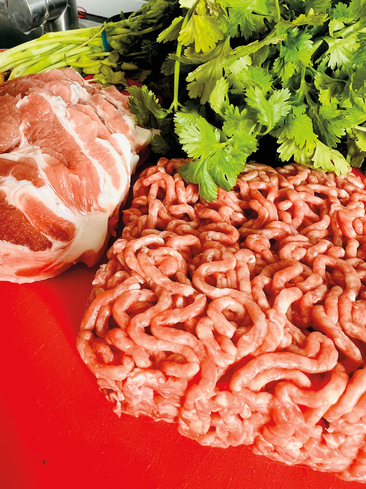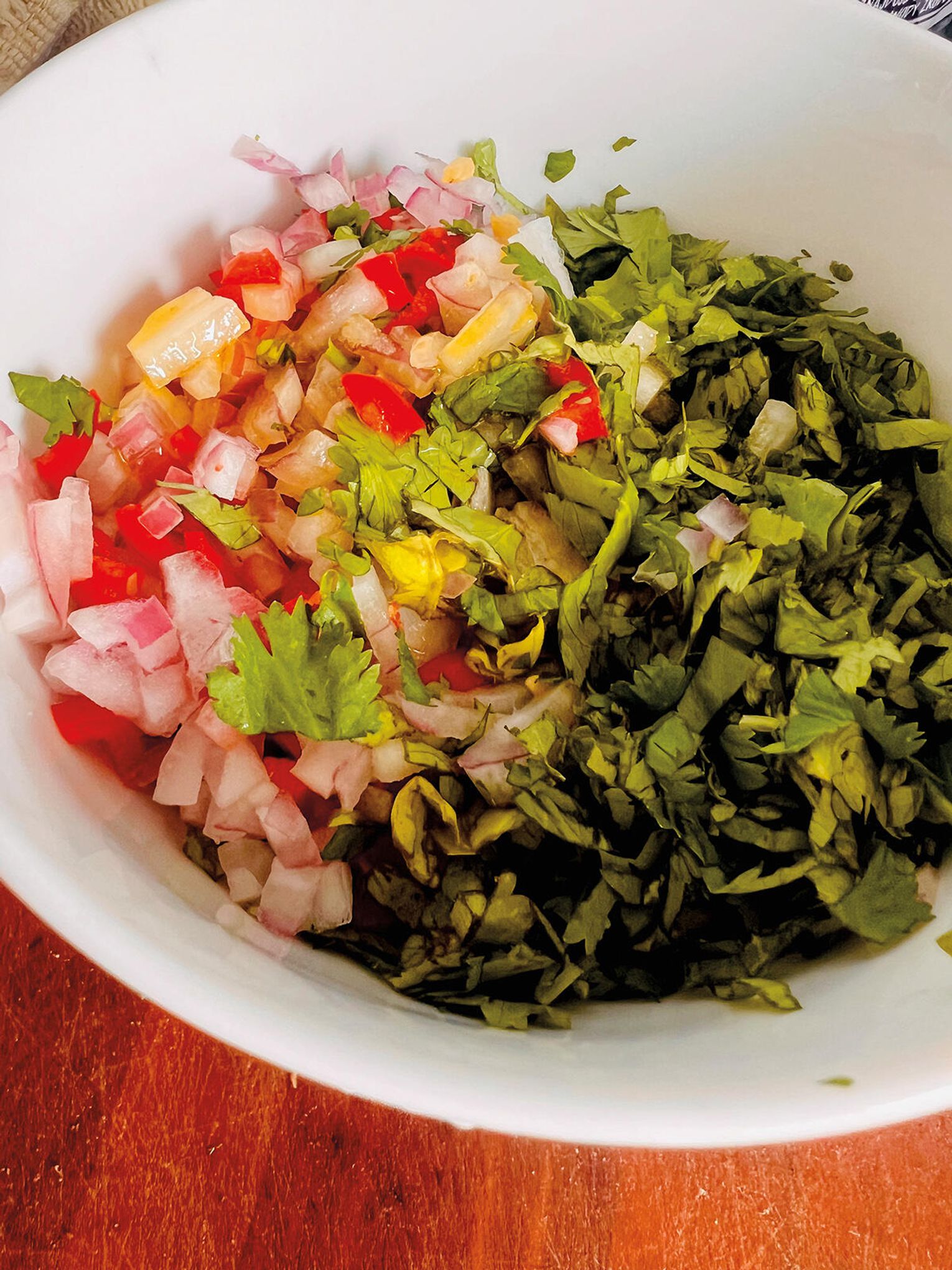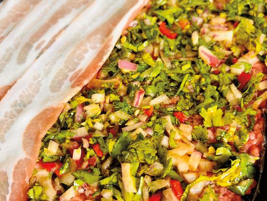 W miseczce wymieszaj wszystkie składniki gremolaty – posiekaną natkę kolendry (albo pietruszkę), bazylię, drobno pokrojone chilli i czerwoną cebulę, oliwę oraz sok z cytryny. Rozprowadź powstałą mieszankę równomiernie na warstwie mięsa mielonego. Na gremolacie ułóż pozostałe plasterki boczku, a całość przykryj drugą połową rozklepanych kotletów, znów w formie prostokąta pasującego do naczynia. Całość przykryj folią spożywczą, żeby w trakcie mrożenia mięso nie wyschło i włóż do zamrażarki na 4-5 godzin.