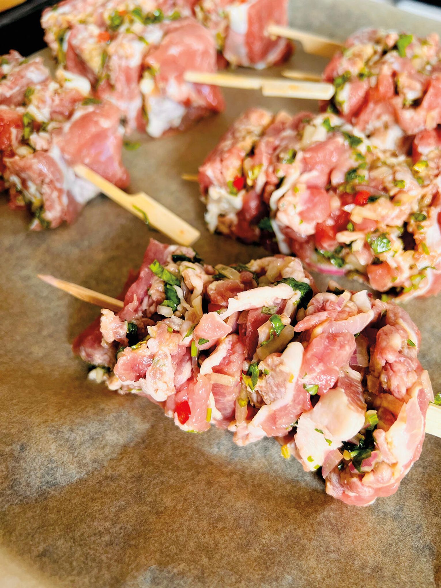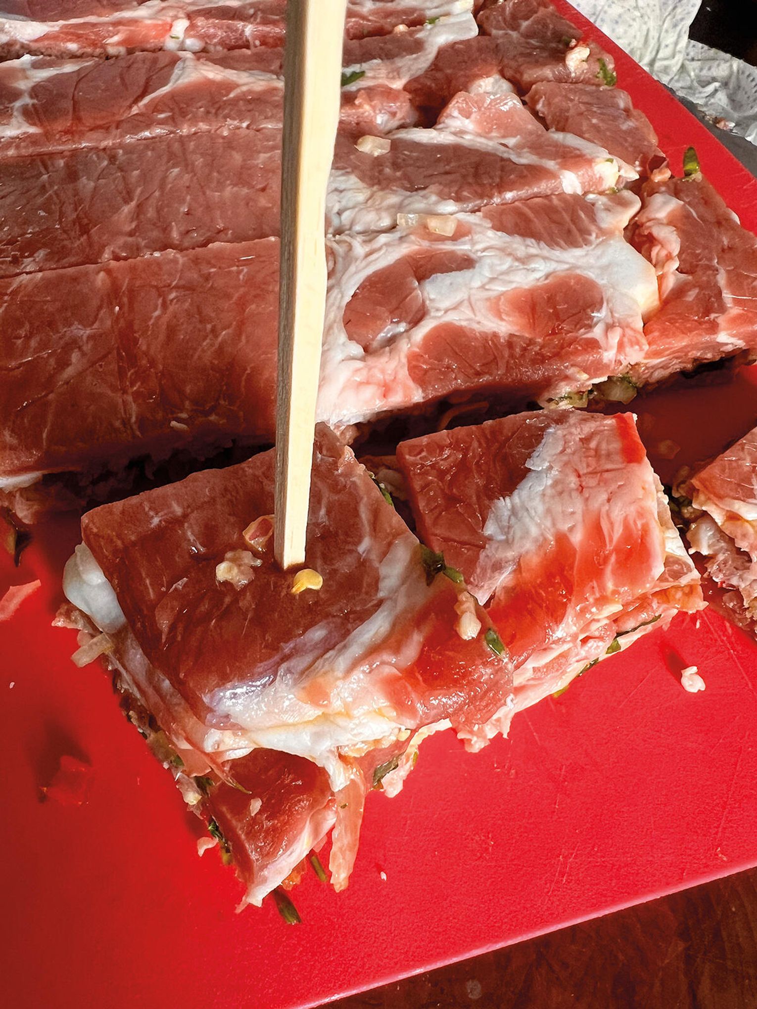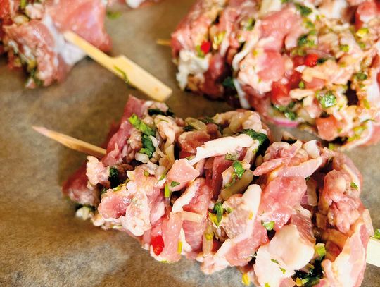 Gdy całość będzie już zamarznięta, ale wciąż na tyle miękka, żeby dało się kroić, wyjmij „placek” z formy i potnij go na kwadraty o boku około 2 cali. Nadziewaj po kilka kwadratów, w zależności od długości szpadki (na moją wchodziło 4). Jeśli pieczesz na grillu, kładź je nad średnim żarem i smaż 7-10 minut z każdej strony, aż mięso będzie złociste i soczyste. W piekarniku ustaw temperaturę na 400°F i również obracaj szpadki co 7 minut, aż będą gotowe.