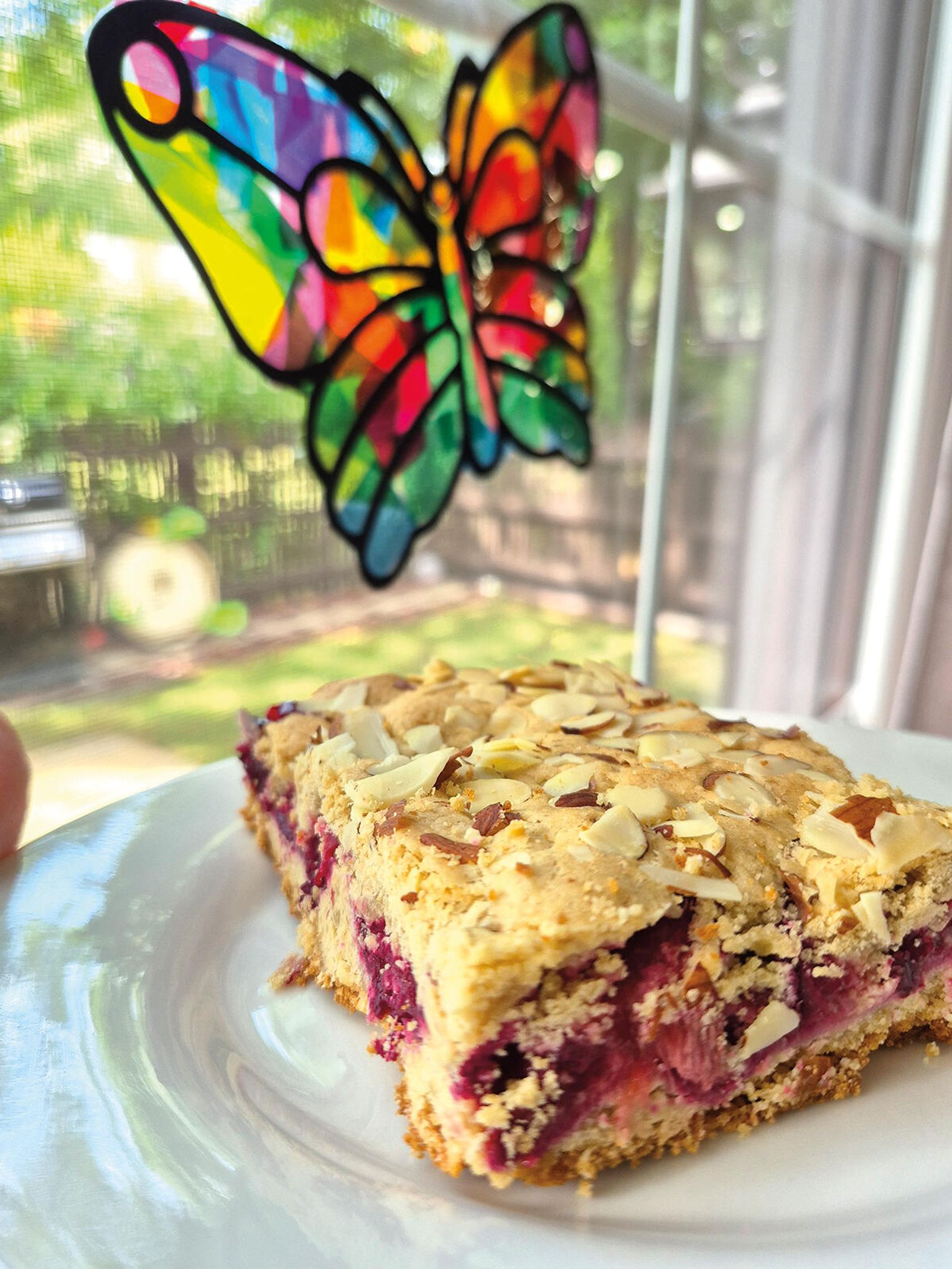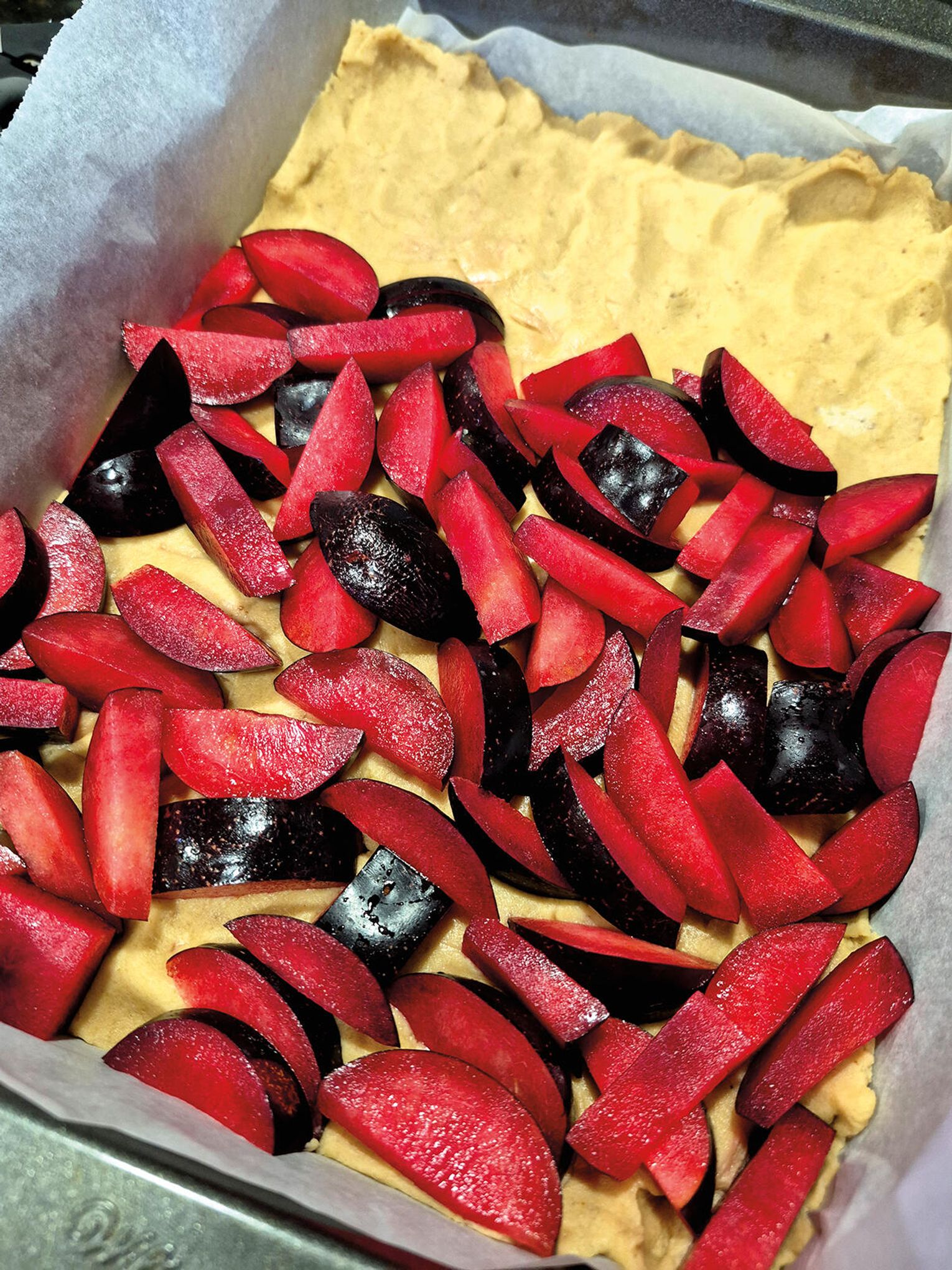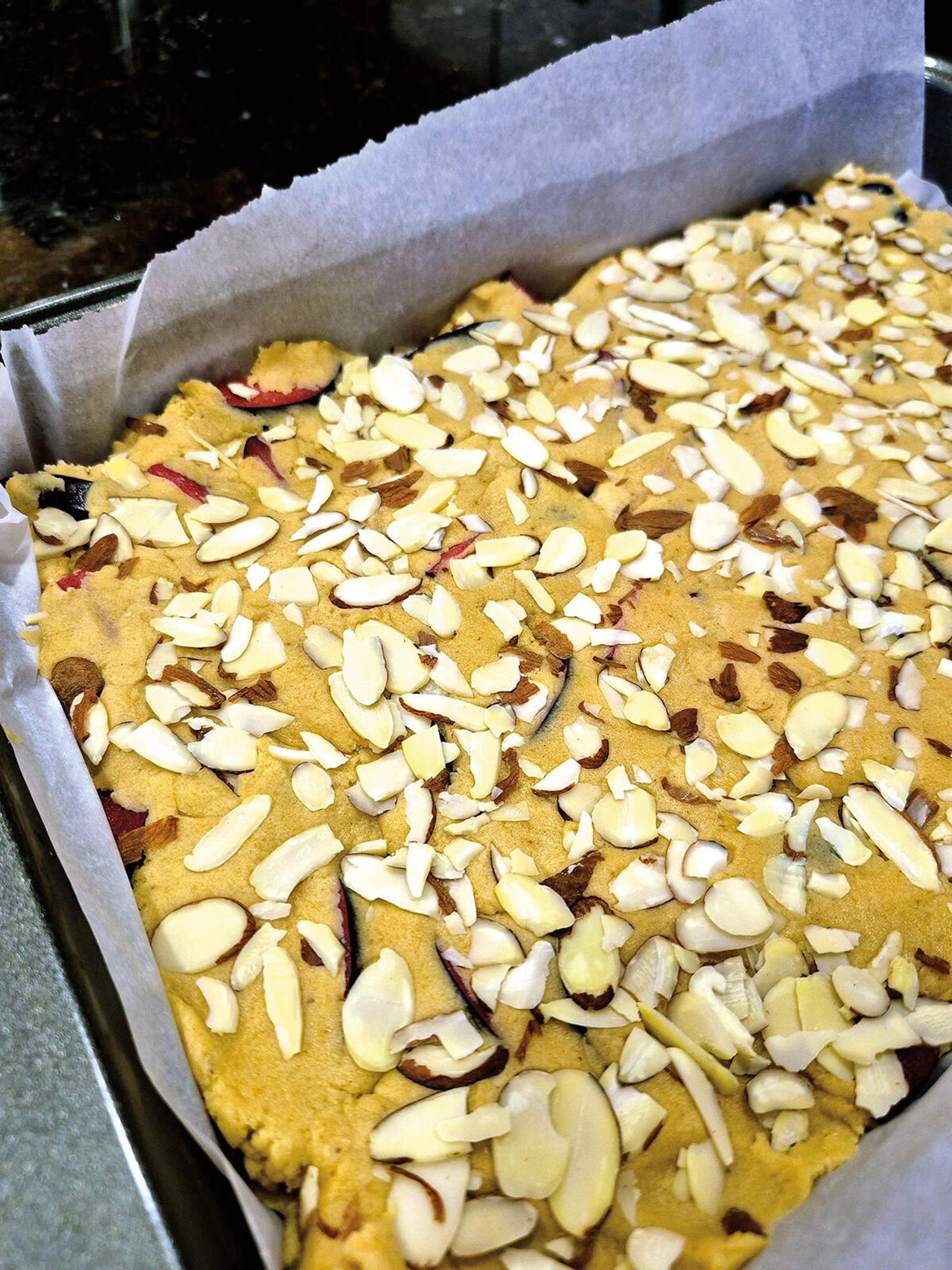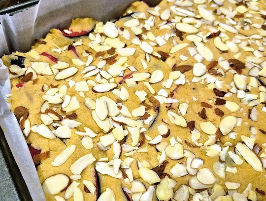 Stopniowo dodawaj suche składniki do masy maślanej, mieszając tylko do połączenia. Ciasto będzie dość gęste. Podziel je na 2 części, wyklej spód, posyp śliwkami i znowu przykryj ciastem. Dociśnij na koniec. Wietrz posypałam migdałami.