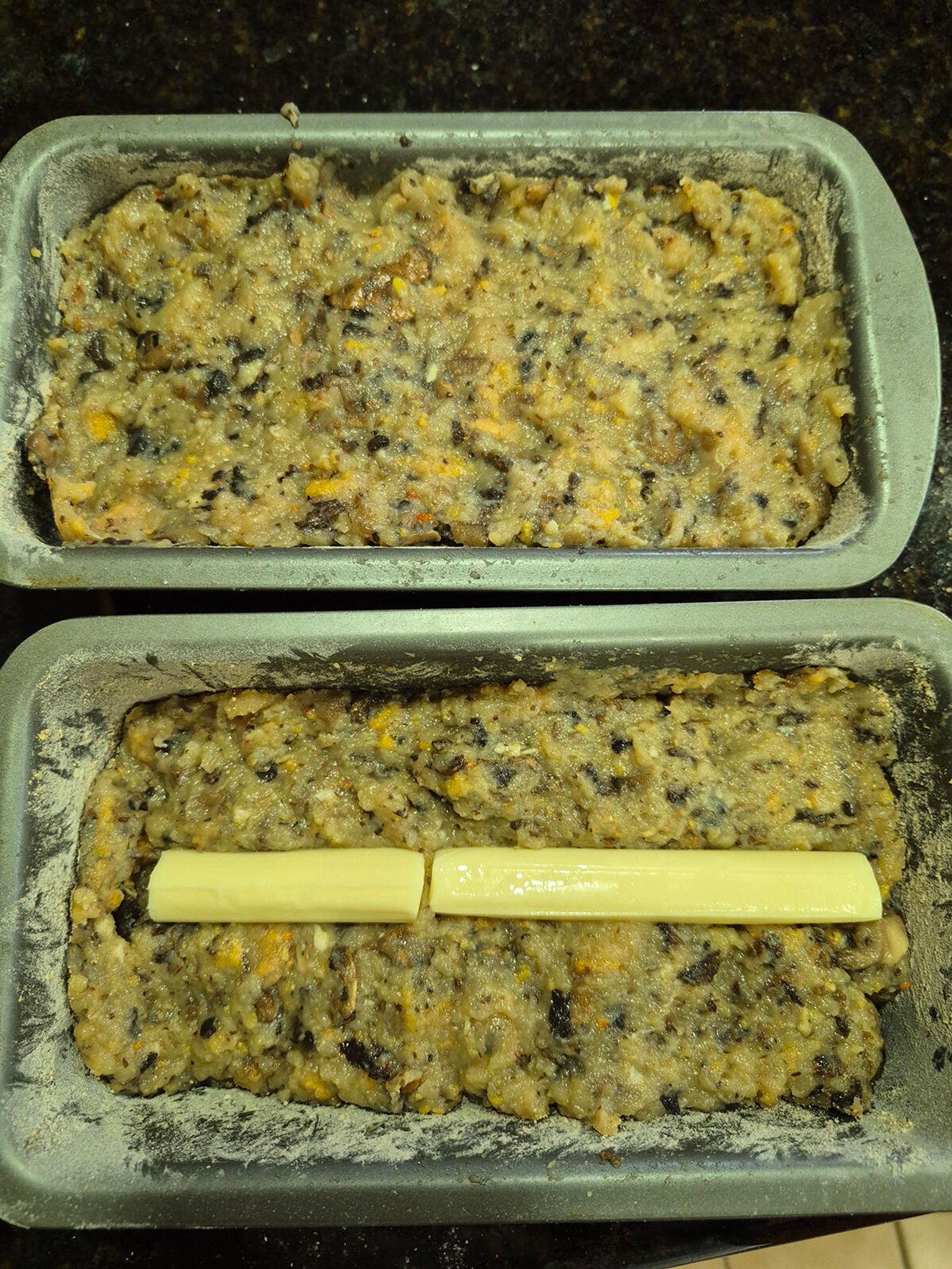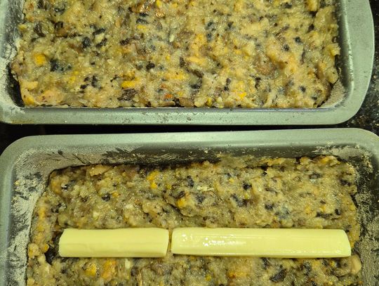 Wymieszaj delikatnie – tylko do połączenia składników. Uformuj bochenek i połóż na blasze wyłożonej papierem do pieczenia lub włóż do foremki typu keksówka.