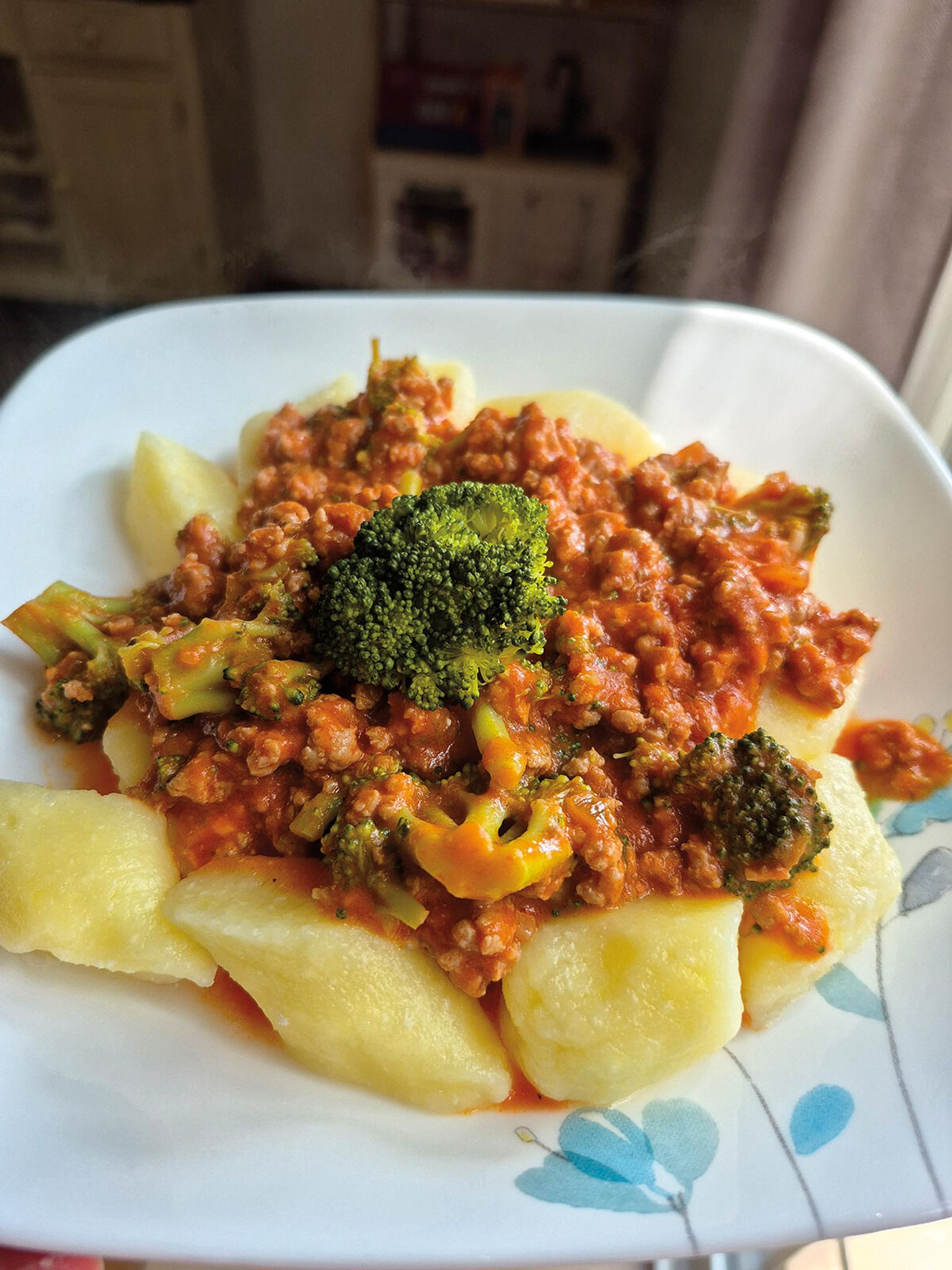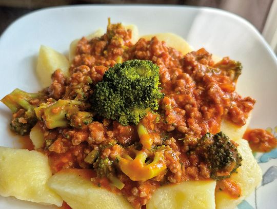 To danie łączy w sobie wszystko co najlepsze w kuchni domowej: miękkie, delikatne kopytka, aromatyczny sos z mieloną wieprzowiną i pomidorami, kremową nutę dzięki serkowi śmietankowemu oraz świeży akcent brokułów.