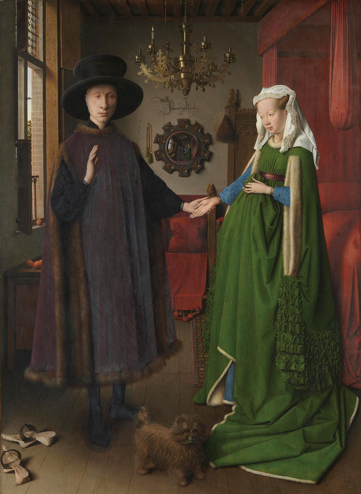 Na obrazie para stoi we wnętrzu mieszkania rozjaśnionego światłem wpadającym przez okno znajdujące się po lewej stronie. Za plecami kobiety znajduje się baldachim, a nad złączonymi dłońmi pary wisi wypukłe lustro, w którym odbijają się ich plecy. W zwierciadle ujrzeć też można odbicia przybyłych na uroczystość świadków, a wśród nich samego artysty. Tuż nad lustrem ozdobionym kolejnymi miniaturowymi portretami można dostrzec autorską sygnaturę artysty: „tak jak potrafię”.