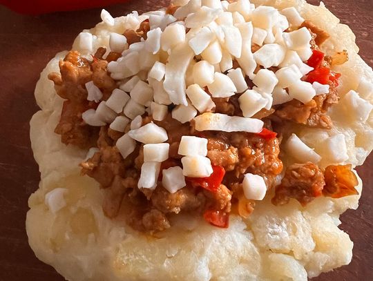 Każdą część ciasta spłaszcz w dłoniach. Nałóż ⅙ farszu i trochę sera. Zlep brzegi, formując kotlet.