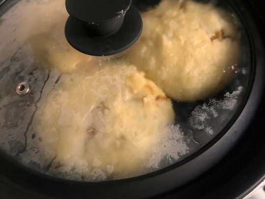 Kiedy ziemniaki się ugotują, odlej wodę, zostawiając na dnie garnka ok. 3-4 łyżki. Dodaj mąkę, przykryj i odstaw na 2-3 minuty. Ugnieć tłuczkiem lub zagnieć w prasce – powinna powstać jednolita masa. Podziel ciasto na 6 równych części.