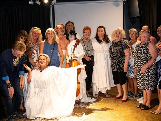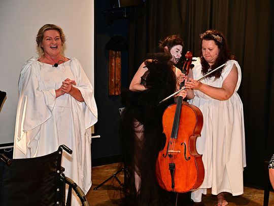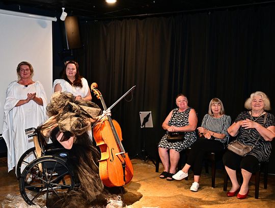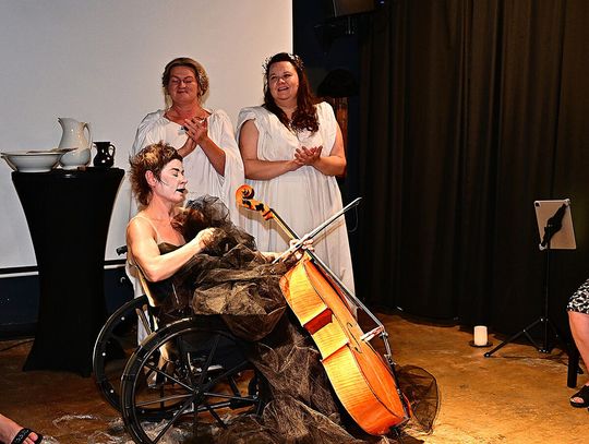 Na scenie widzom towarzyszyła intrygująco mroczna postać z wiolonczelą (Naga Śmierć – Lilianna Zofia Wośko). Przejmujące, nieustanne, rwane, czasami niezidentyfikowane, szarpane, momentami melancholijne, chwilowo harmonijne, dźwięki instrumentu były wyrazem egzystencjalnej obsesji, związanej z doświadczeniami osobistymi poety należącego do pokolenia naznaczonego wojną i powojenną traumą. Jej obecność to także próba znalezienia w umieraniu sensu, a „nagość” to jej obraz bez upiększeń i iluzji.
