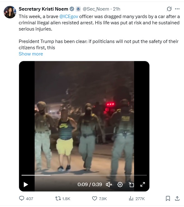 Noem we wpisie na X odniosła się również do tragicznego incydentu sprzed kilku dni – śmiertelnego postrzelenia imigranta Silverio Villegasa-Gonzaleza przez agenta ICE w Franklin Park na północno-zachodnich przedmieściach Chicago. Wówczas jeden z funkcjonariuszy został ciężko ranny po tym, jak został ciągnięty przez samochód próbującego uciekać Villegasa-Gonzaleza.