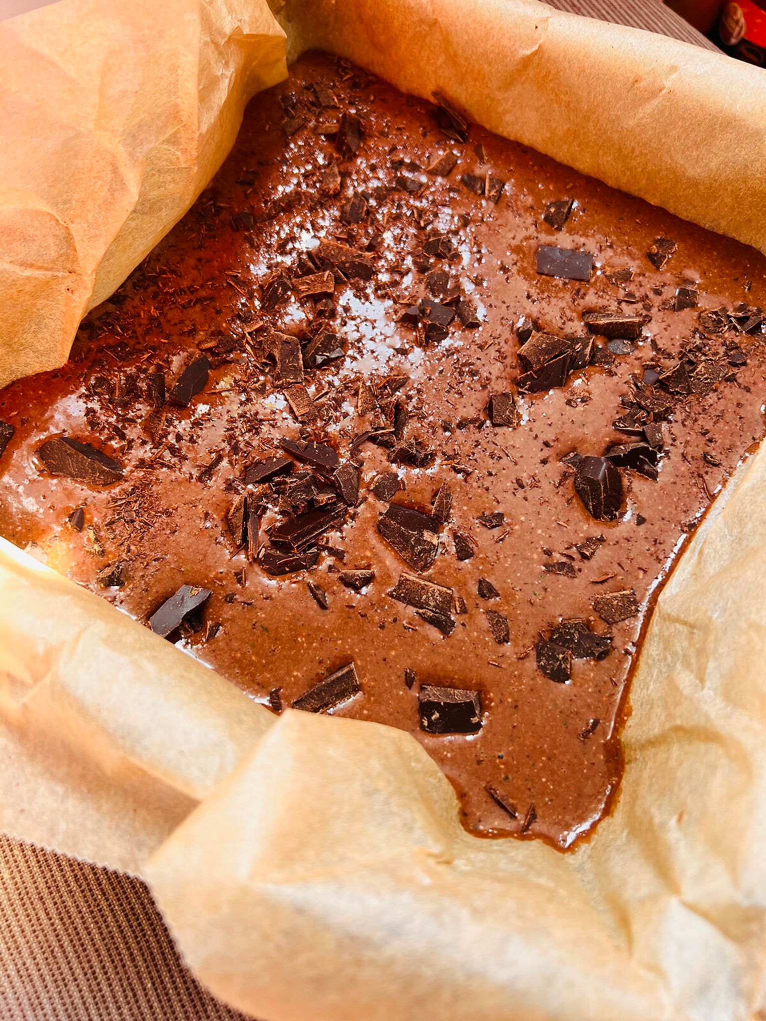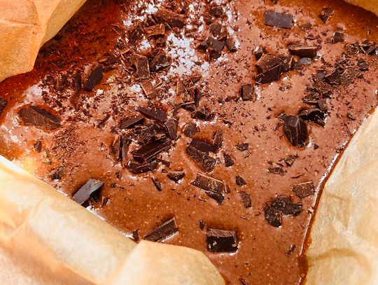 Masę przelej do foremki wyłożonej papierem do pieczenia (ja użyłam kwadratowej 9×9 cala). Na koniec posyp grubo posiekaną czekoladą na wierzchu.