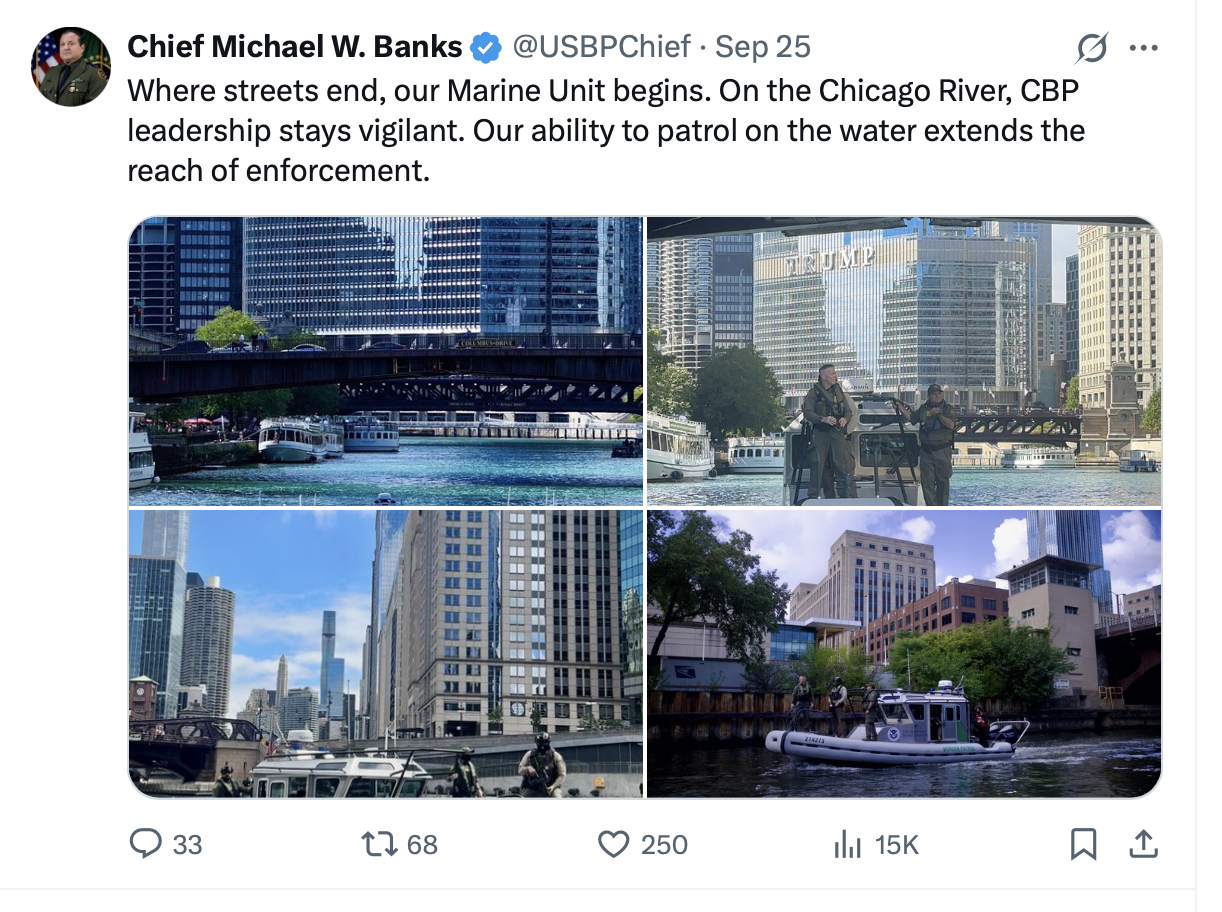 „Tam, gdzie kończą się ulice, zaczyna działać nasza jednostka wodna” – napisano we wpisach CBP w mediach społecznościowych, którym towarzyszyły zdjęcia z rejsu, w tym kilka z Trump Tower w tle. „Na rzece Chicago kierownictwo CBP pozostaje czujne. Nasza zdolność patrolowania wody zwiększa zasięg działań egzekucyjnych” – podkreślono.