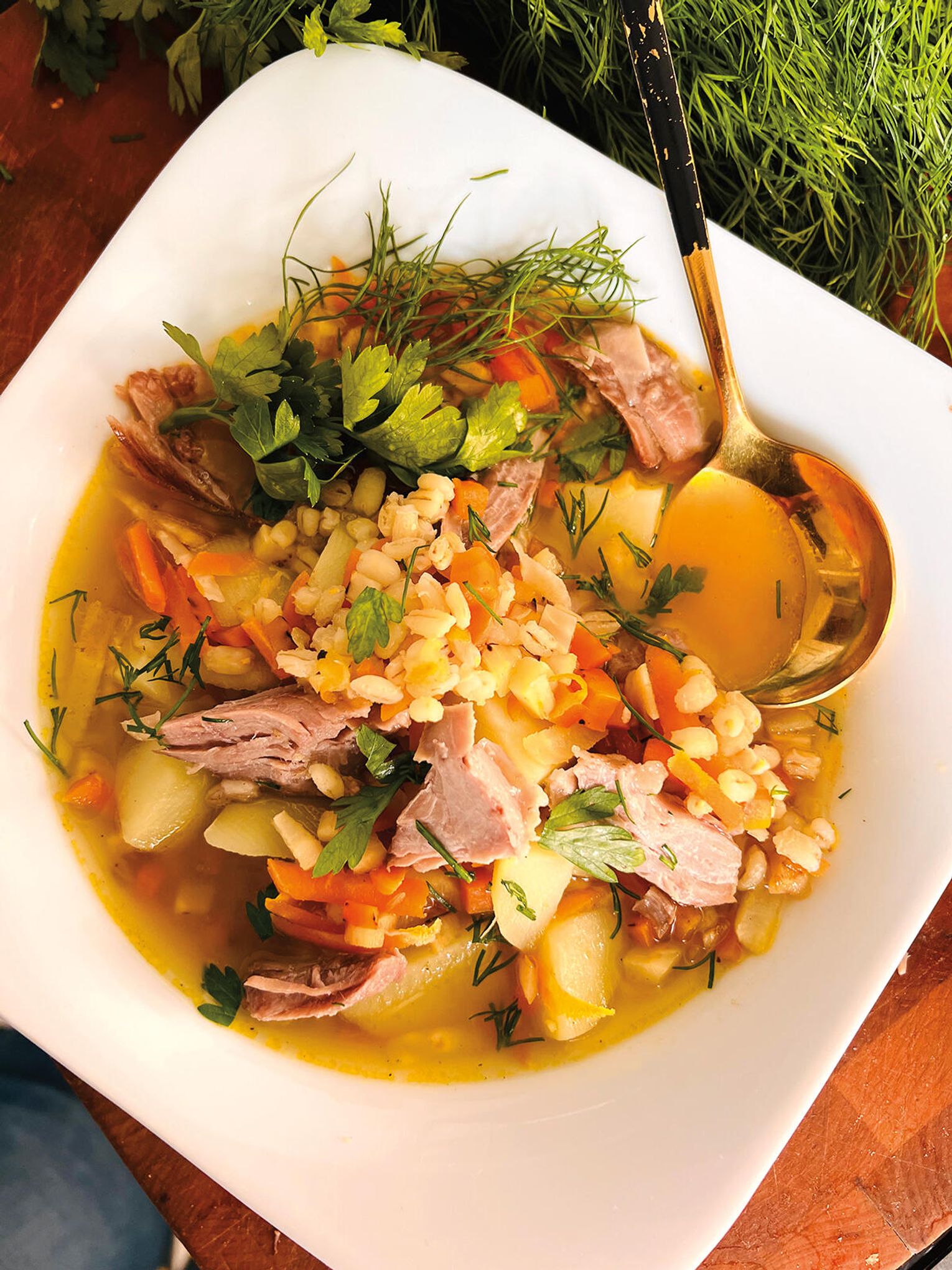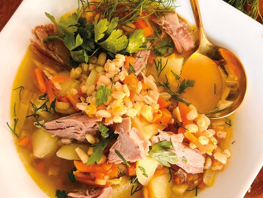 Do zupy wsyp opłukany pęczak oraz ziemniaki, wymieszaj i gotuj na małym ogniu przez 20–25 minut, aż kasza będzie miękka. Gdy to się stanie, dorzuć posiekane mięso z wołowiny i indyka.