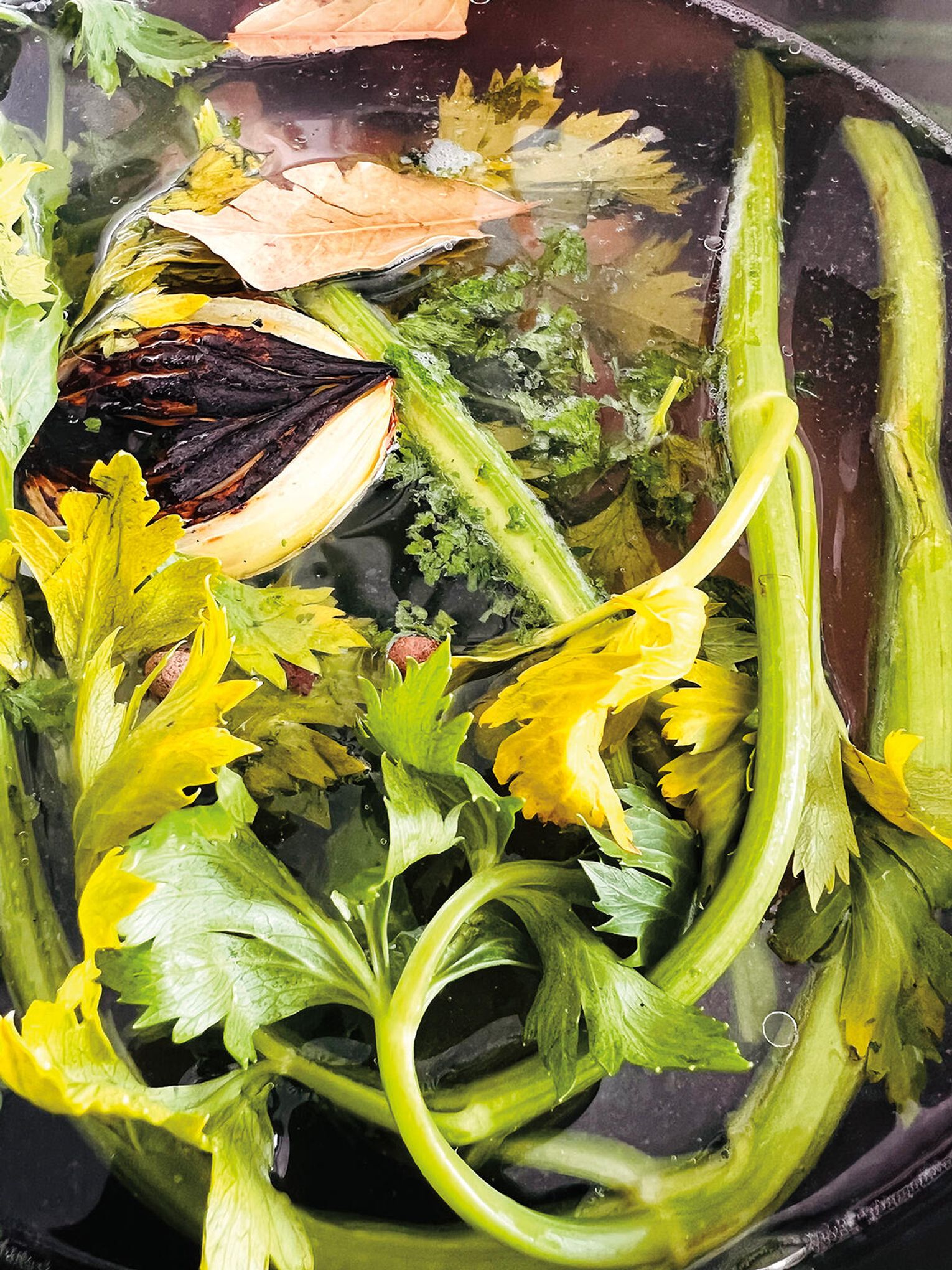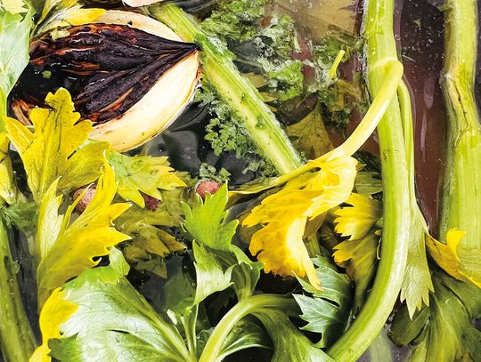 Do dużego garnka włóż wołowinę, gicz indyka, opaloną cebulę, kilka gałązek natki pietruszki, ziele angielskie i liście laurowe. Całość zalej zimną wodą, posól i postaw na średni ogień. Gdy zupa zacznie się gotować, zbierz szumowiny z powierzchni, a następnie zmniejsz ogień do minimum i gotuj wywar przez około 2 godziny, aż mięso będzie miękkie, a bulion nabierze głębokiego, aromatycznego smaku.