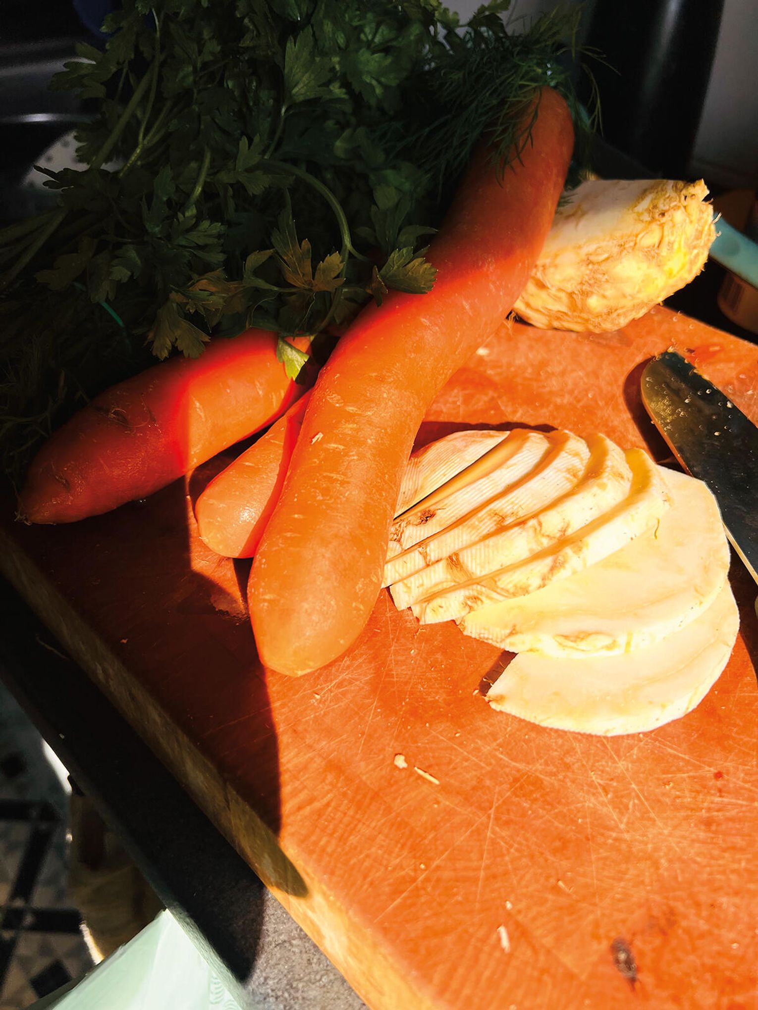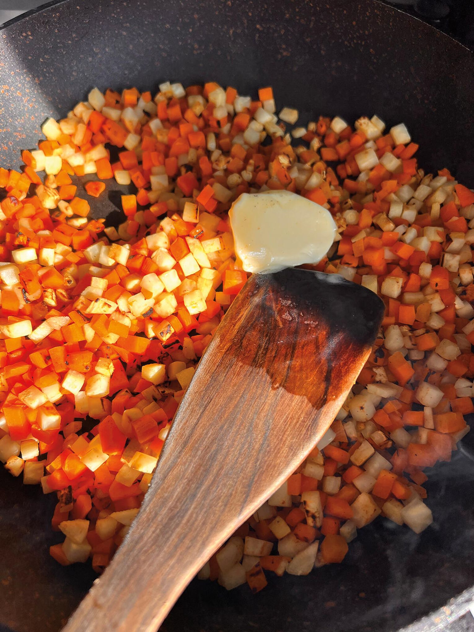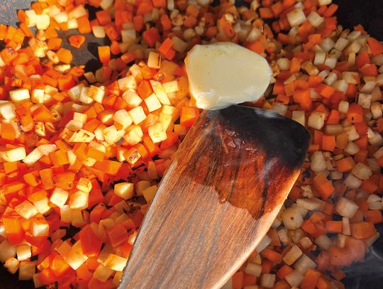Pokrojone warzywa wrzuć na suchą, dobrze rozgrzaną patelnię i praż przez kilka minut, aż lekko się przypalą i zaczną pachnieć słodko. Wtedy dodaj masło, zamieszaj i smaż jeszcze chwilę, po czym przełóż wszystko do garnka z przecedzonym wywarem. Dodaj również starte warzywa – dzięki temu zupa zyska i głębię, i lekką gęstość.
