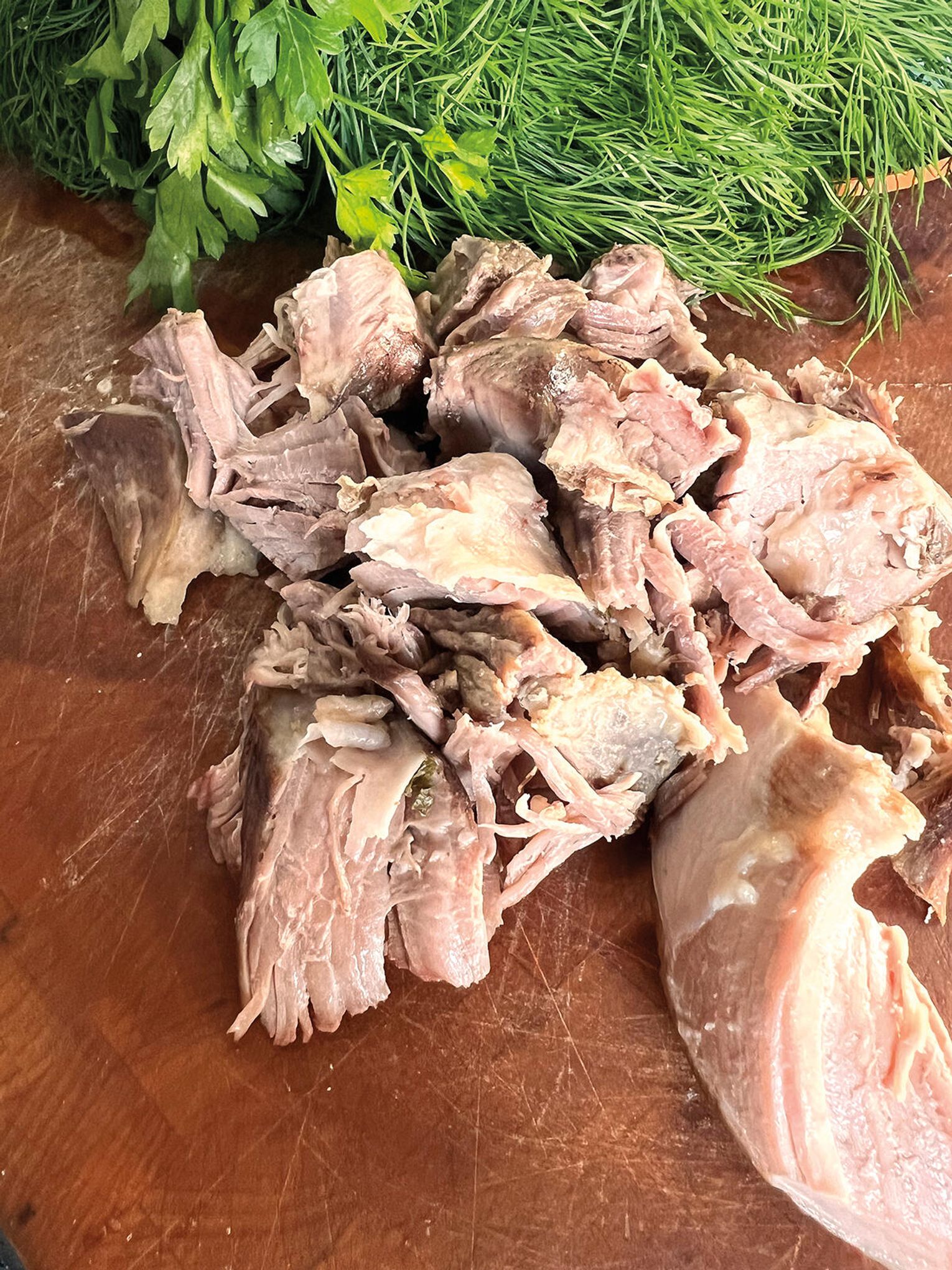 Po ugotowaniu przecedź wywar, mięso odstaw do wystudzenia, obierz z kości i posiekaj na drobne kawałki. W tym czasie przygotuj warzywa – połowę pietruszki, marchewki i selera pokrój w drobną kostkę, a drugą połowę zetrzyj na tarce o dużych oczkach (albo wrzuć do malaksera).
