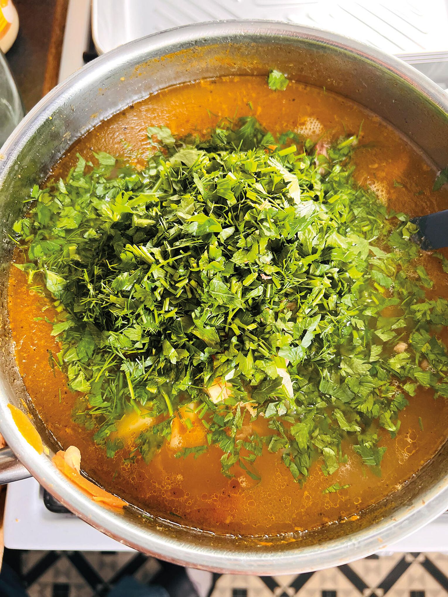 Na sam koniec dodaj posiekany koperek i natkę pietruszki. Przykryj garnek i odstaw zupę na około 10 minut, żeby smaki się przegryzły.