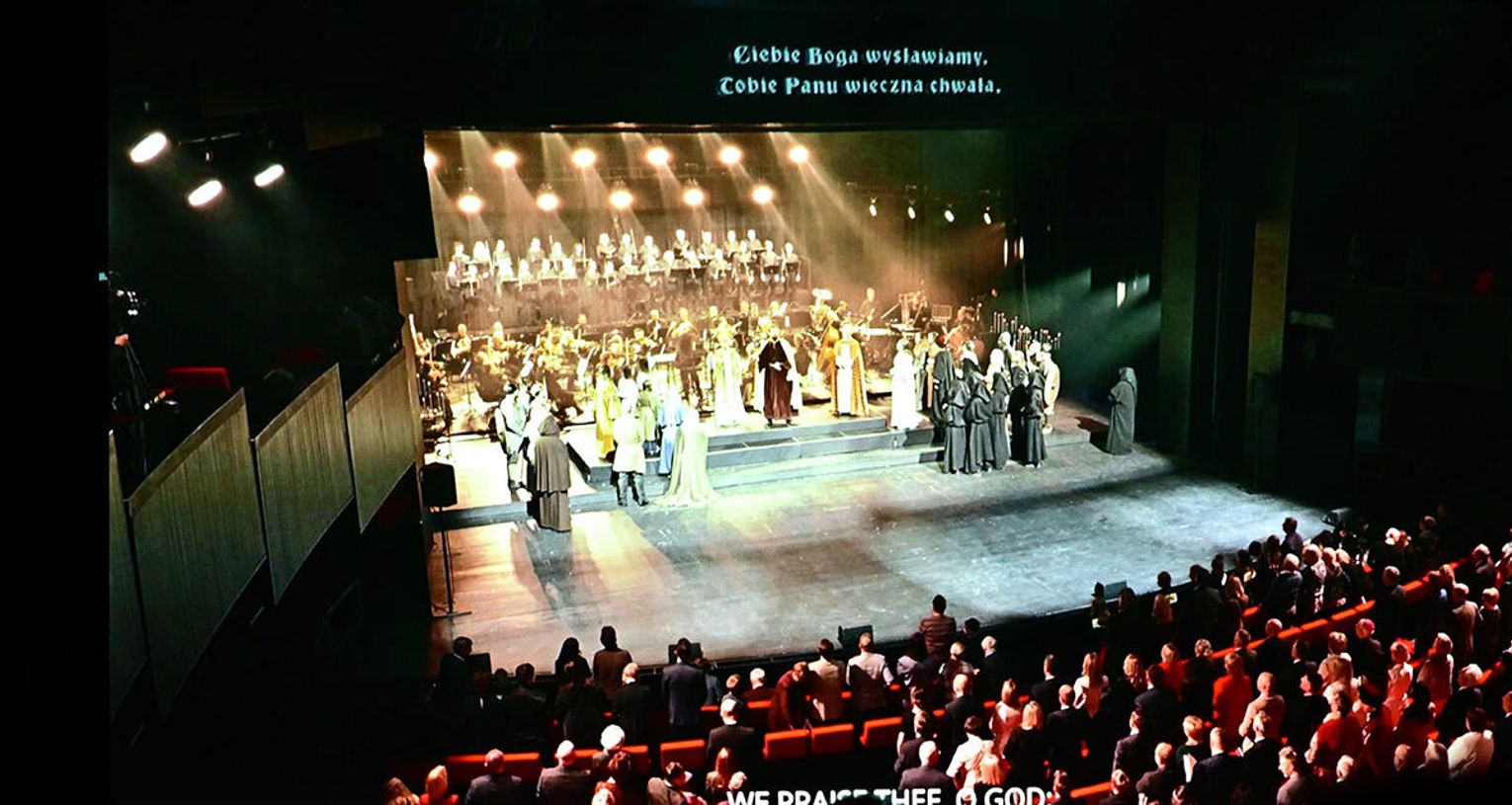 W sali Paderewski Symphony Orchestra w Chicago zaprezentowano na ekranie obszerny zapis filmowy tego przedstawienia. Choć wersja kinowa została skrócona z uwagi na wymogi narracyjne i czasowe, nie straciła swojej siły oddziaływania – nadal poruszała, angażowała emocje i skłaniała do refleksji. Spektakl „Koronacja” w mistrzowski sposób splata opowieść o przeszłości z pytaniami o współczesność i przyszłość. Reżyser prowadzi widza przez proces dojrzewania narodowej tożsamości, pokazując cenę, jaką trzeba było zapłacić – często w postaci krwi, wyrzeczeń i trudnych wyborów moralnych. Język spektaklu jest zrozumiały, celnie komentujący rzeczywistość, miejscami ironiczny, co wzbogaca wartość przekazu. „Koronacja”, w czasach globalizacji i zacierania różnic, przypomina o konieczności pielęgnowania wartości budujących narodowe „ja” – rozumiane nie tylko jako granice państwa, ale jako spuściznę historycznych doświadczeń, pamięci pokoleń, patriotyzmu i chrześcijańskich fundamentów. Publiczność przyjęła spektakl z entuzjazmem, a najbardziej wzruszającym momentem był spontaniczny udział widowni w wykonaniu hymnu „Te Deum” – „Ciebie, Boga, wysławiamy” wraz z aktorami i postaciami na ekranie.