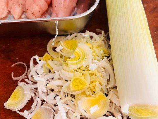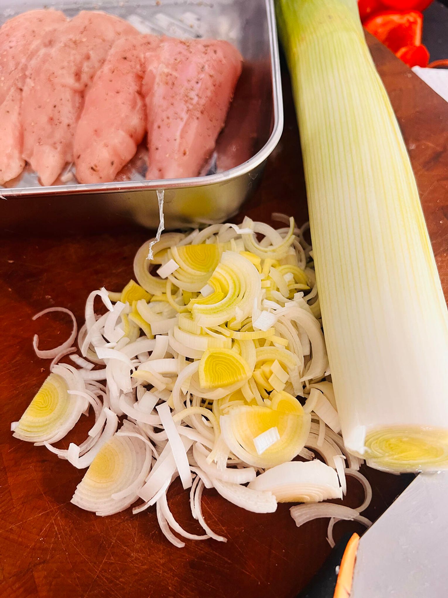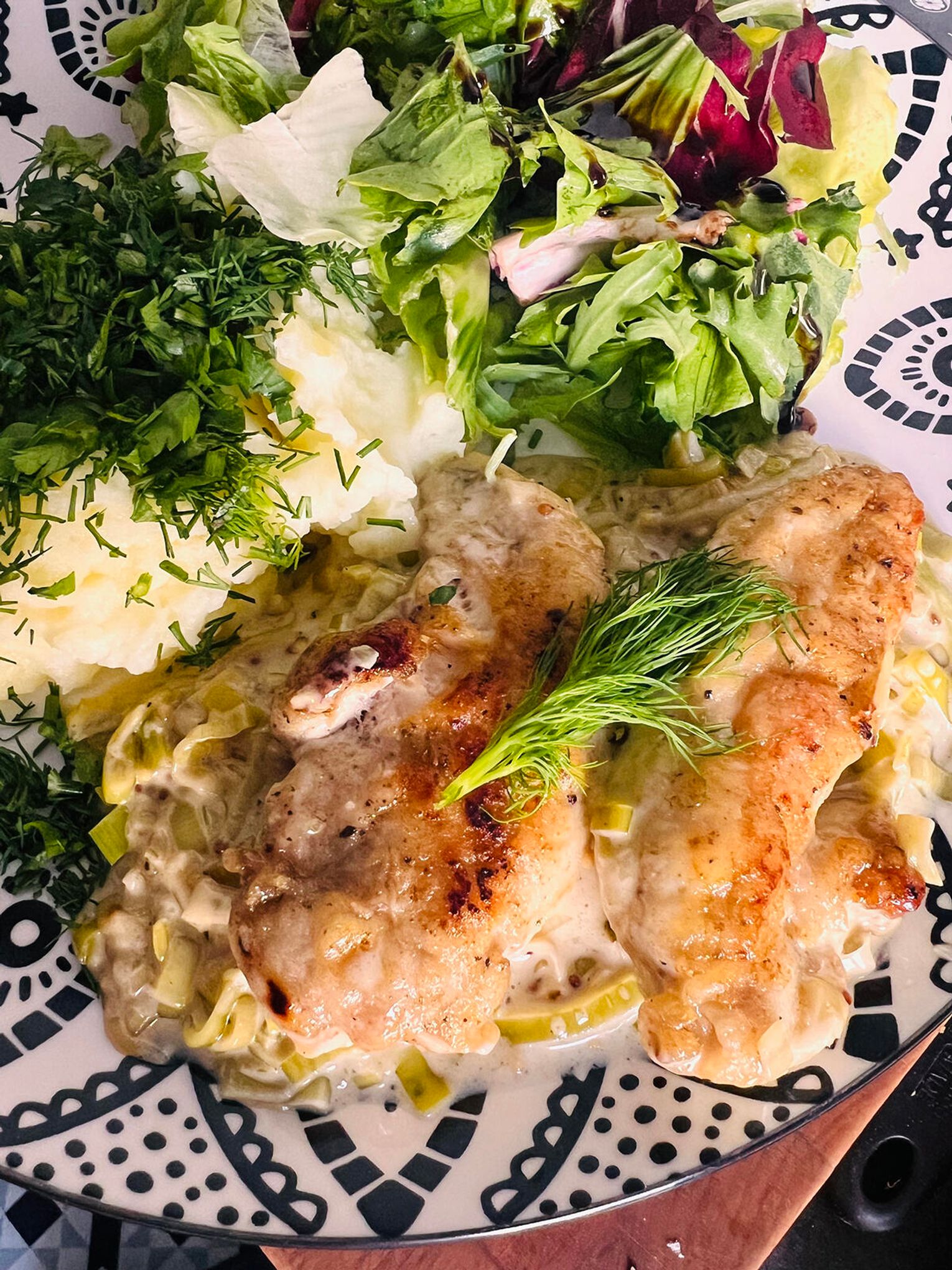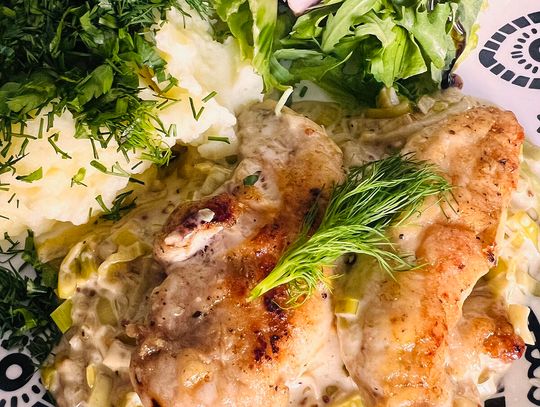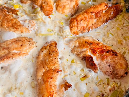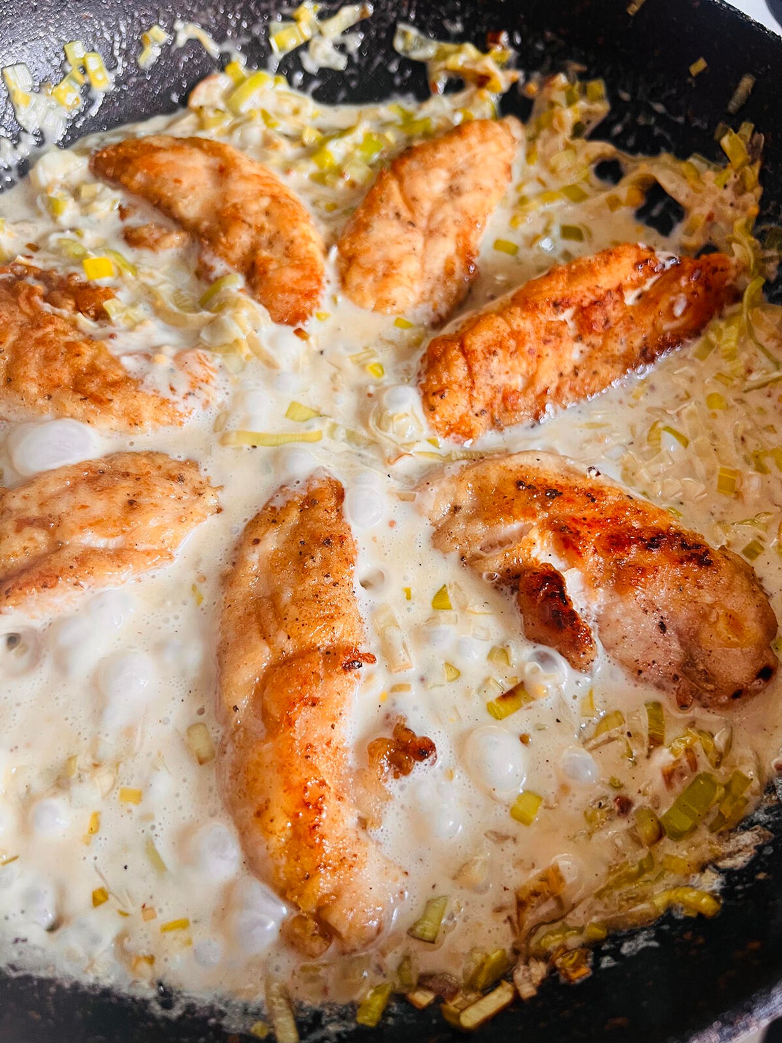 To danie łączy w sobie wszystko, co człowiek lubi: miękkie mięso, sos o głębokim smaku i ten moment, kiedy zanurzasz kawałek bagietki w patelni i myślisz „no dobra, to jest szczęście”. Jest kremowo, lekko słodko, trochę pikantnie – w sam raz, żeby poprawić humor po długim dniu, albo po prostu sprawić sobie małą przyjemność. Bez wyrzutów sumienia, bo przecież to wciąż kurczak i por – czysta dieta, prawda? (Śmietanka się nie liczy!)