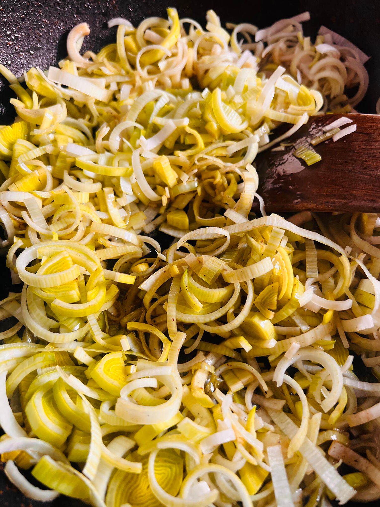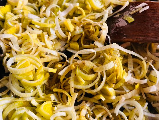 Pora oczyść dokładnie i pokrój w półplasterki (białą część). Szalotkę posiekaj. Na tę samą patelnię dodaj łyżkę masła, a kiedy się rozpuści, wsyp pora i szalotkę. Posól lekko i smaż kilka minut, aż warzywa zrobią się miękkie i lekko słodkie. Dodaj przeciśnięty przez praskę czosnek, a po chwili łyżkę miodu. Zwiększ ogień i pozwól, by wszystko chwilę się skarmelizowało – wystarczy 1 minuta.
