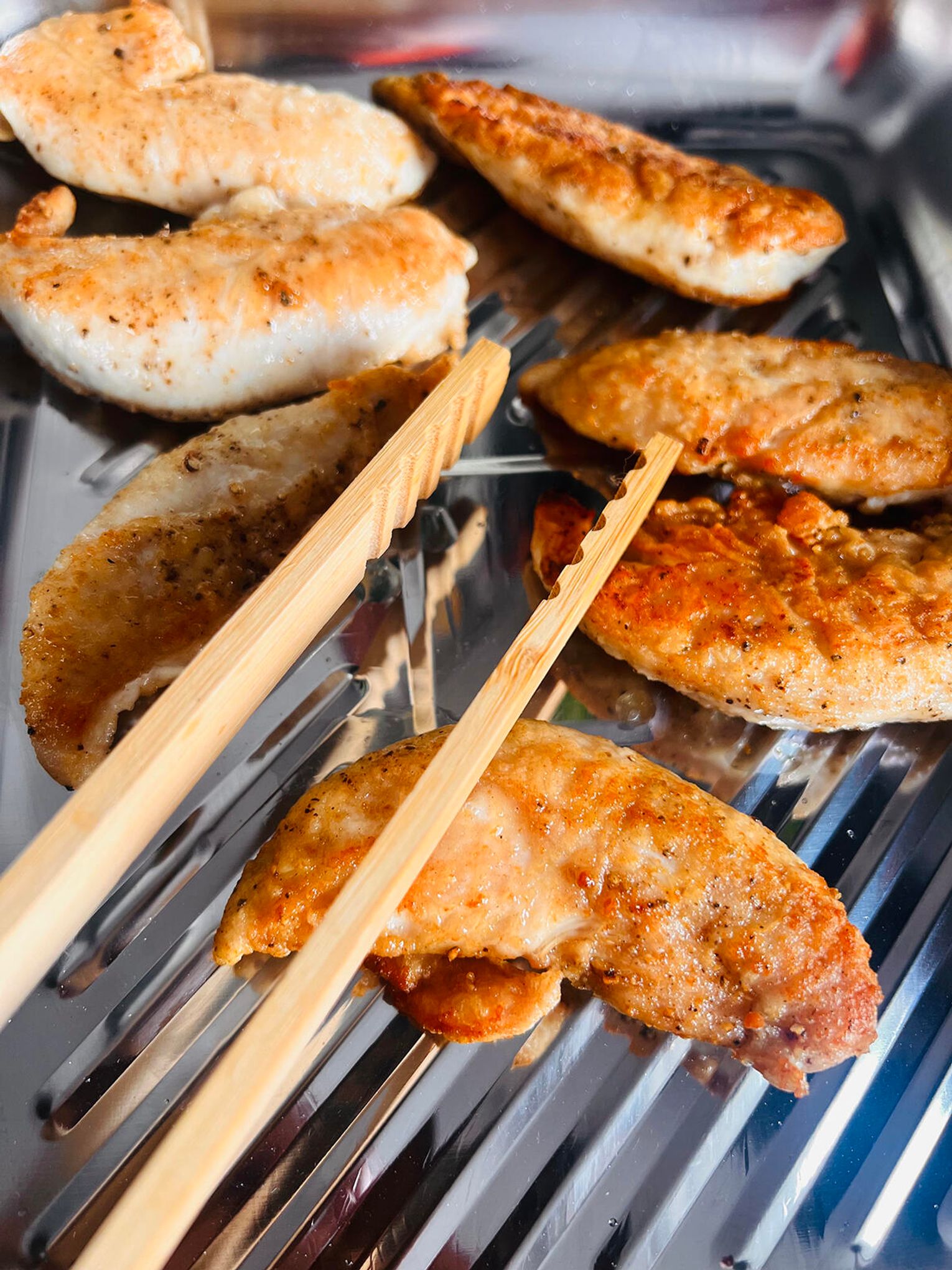 Polędwiczki z kurczaka umyj, osusz i dopraw solą oraz pieprzem z obu stron. Oprósz delikatnie mąką, żeby później złapały ładną, złocistą skórkę. Na dużej patelni rozgrzej oliwę i wrzuć mięso, smaż na średnim ogniu, aż z każdej strony będzie rumiane. Gotowe kawałki odłóż na talerz.