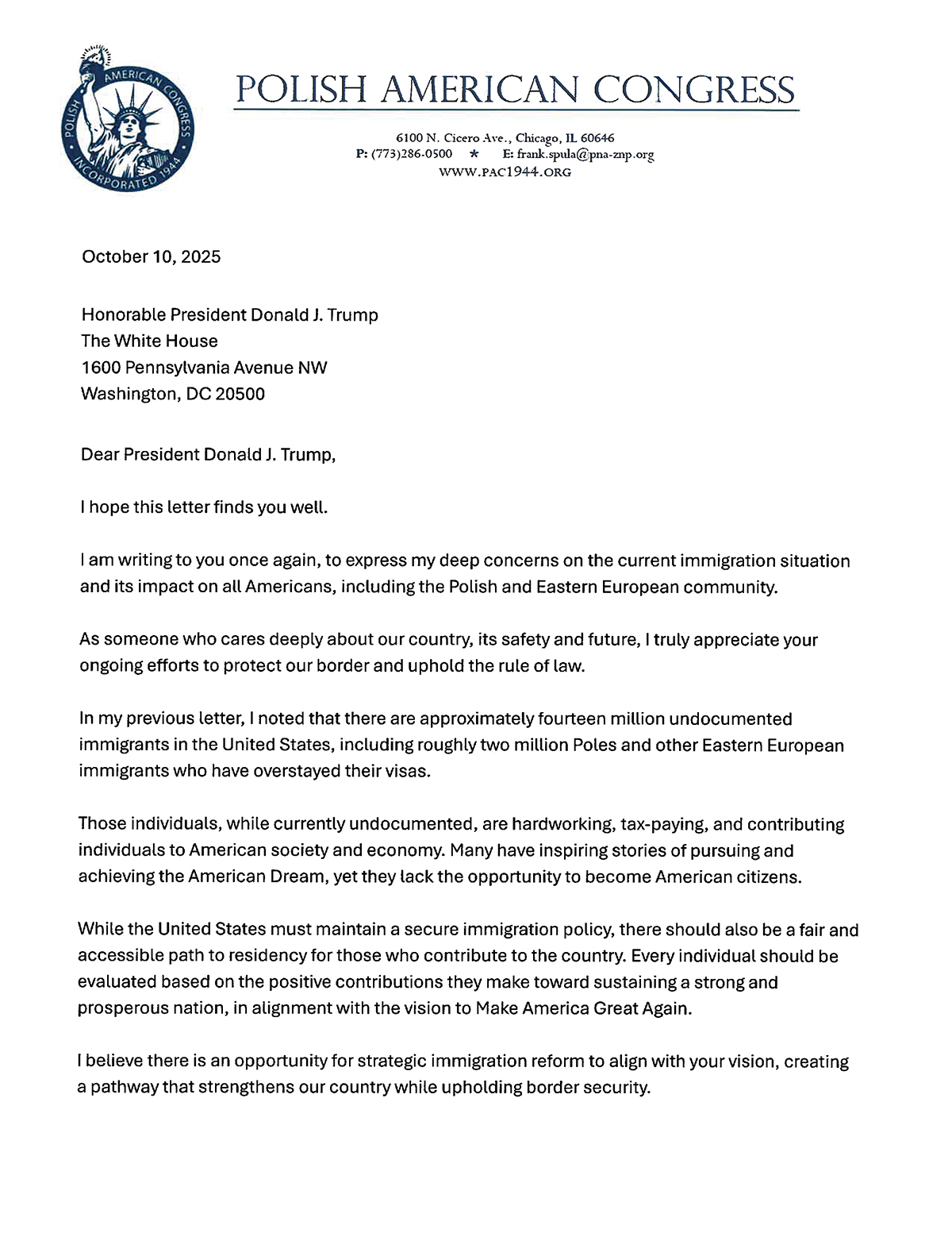 Jako osoba, której głęboko leży na sercu dobro naszego kraju, jego bezpieczeństwo i przyszłość, bardzo doceniam Pana nieustające wysiłki na rzecz ochrony naszych granic i przestrzegania praworządności. W poprzednim liście pisałem, że w Stanach Zjednoczonych przebywa około czternaście milionów nieudokumentowanych imigrantów, w tym około dwa miliony Polaków i innych imigrantów z Europy Wschodniej, którzy przekroczyli ważność wiz.