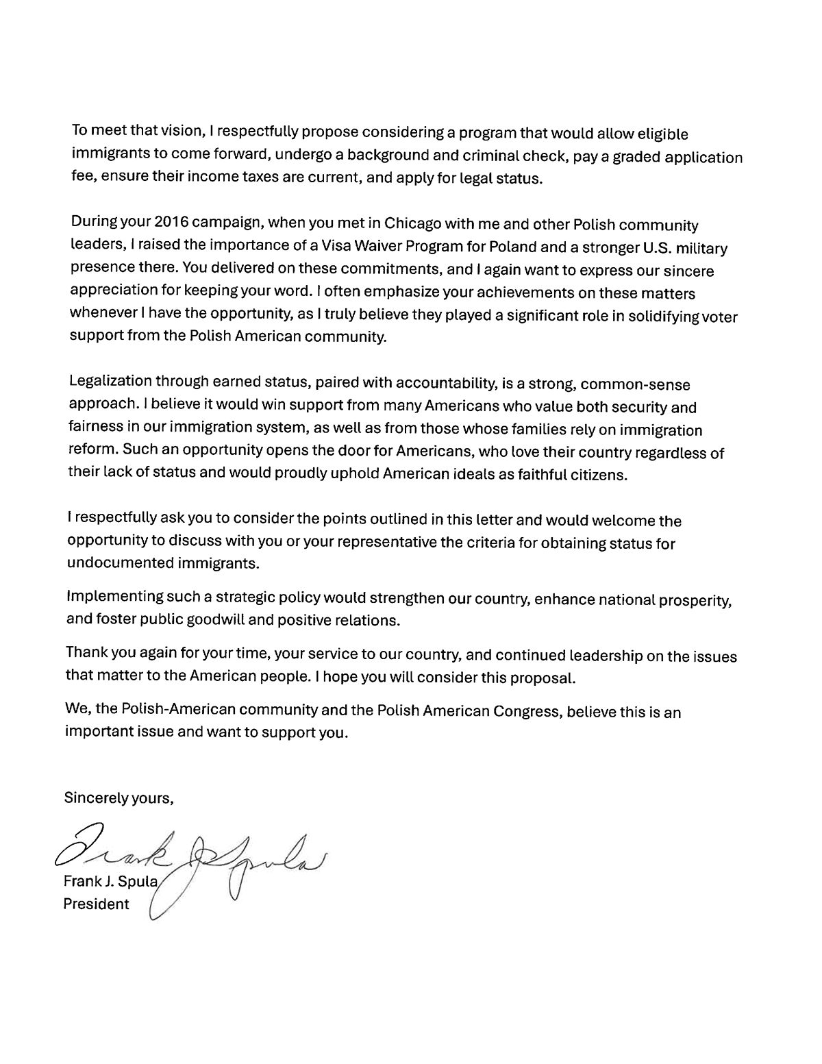 Zanim Frank J. Spula zakończył 17 października br. długoletnie sprawowanie urzędu prezesa Kongresu Polonii Amerykańskiej, wysłał do prezydenta Donalda Trumpa list wskazujący na korzyści, jakie wiązałyby się z legalizacją statusu kwalifikujących się nieudokumentowanych imigrantów. W swoim liście – już drugim na ten temat – do prezydenta USA, z datą 10 października, Frank Spula, który jest również prezesem Związku Narodowego Polskiego (Polish National Alliance, PNA), zapewnia o swojej gotowości do współpracy z federalną administracją, jeśli jego propozycja spotka się z przychylnym przyjęciem. Publikujemy oryginalną wersję najnowszego listu i jego tłumaczenie na język polski.