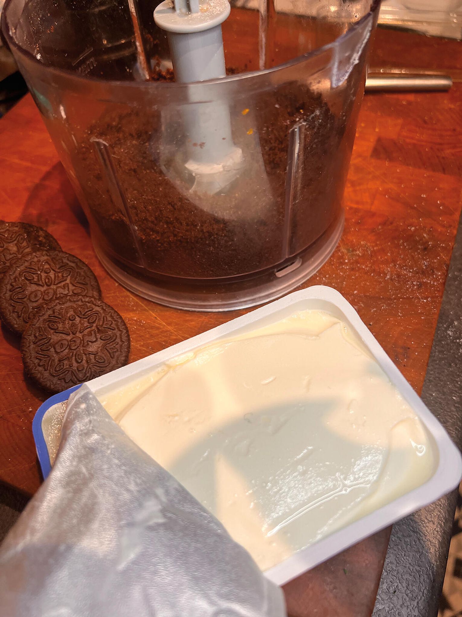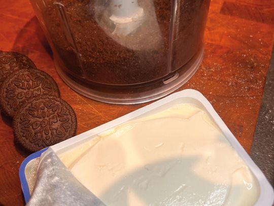 Ciasteczka Oreo zblenduj lub rozgnieć w moździerzu – nie muszą być na pył, mogą mieć drobne kawałeczki. Wymieszaj z serkiem śmietankowym, aż powstanie gęsty, kremowy mus. Jeśli chcesz, posmakuj i dodaj odrobinę cukru pudru.
