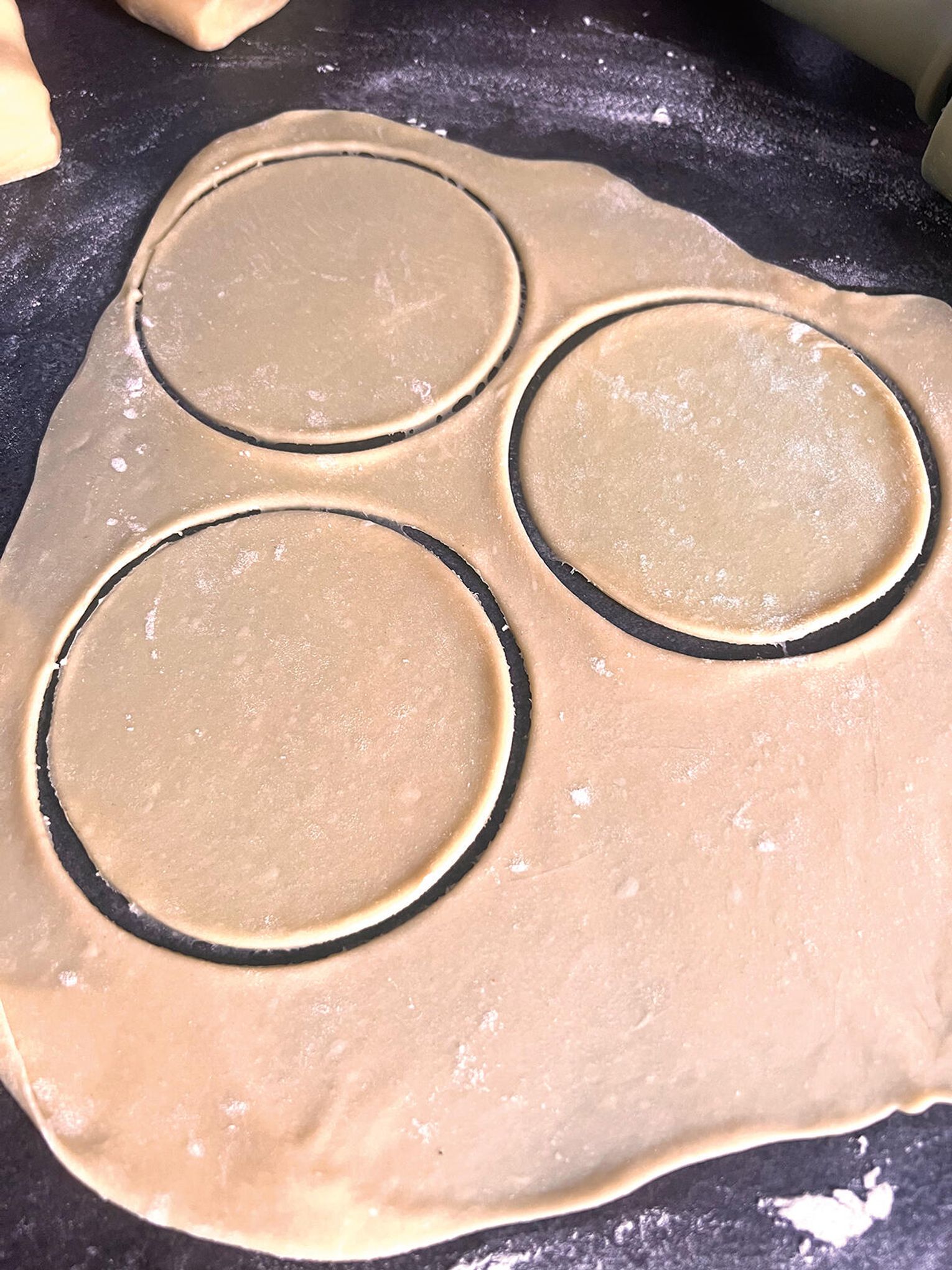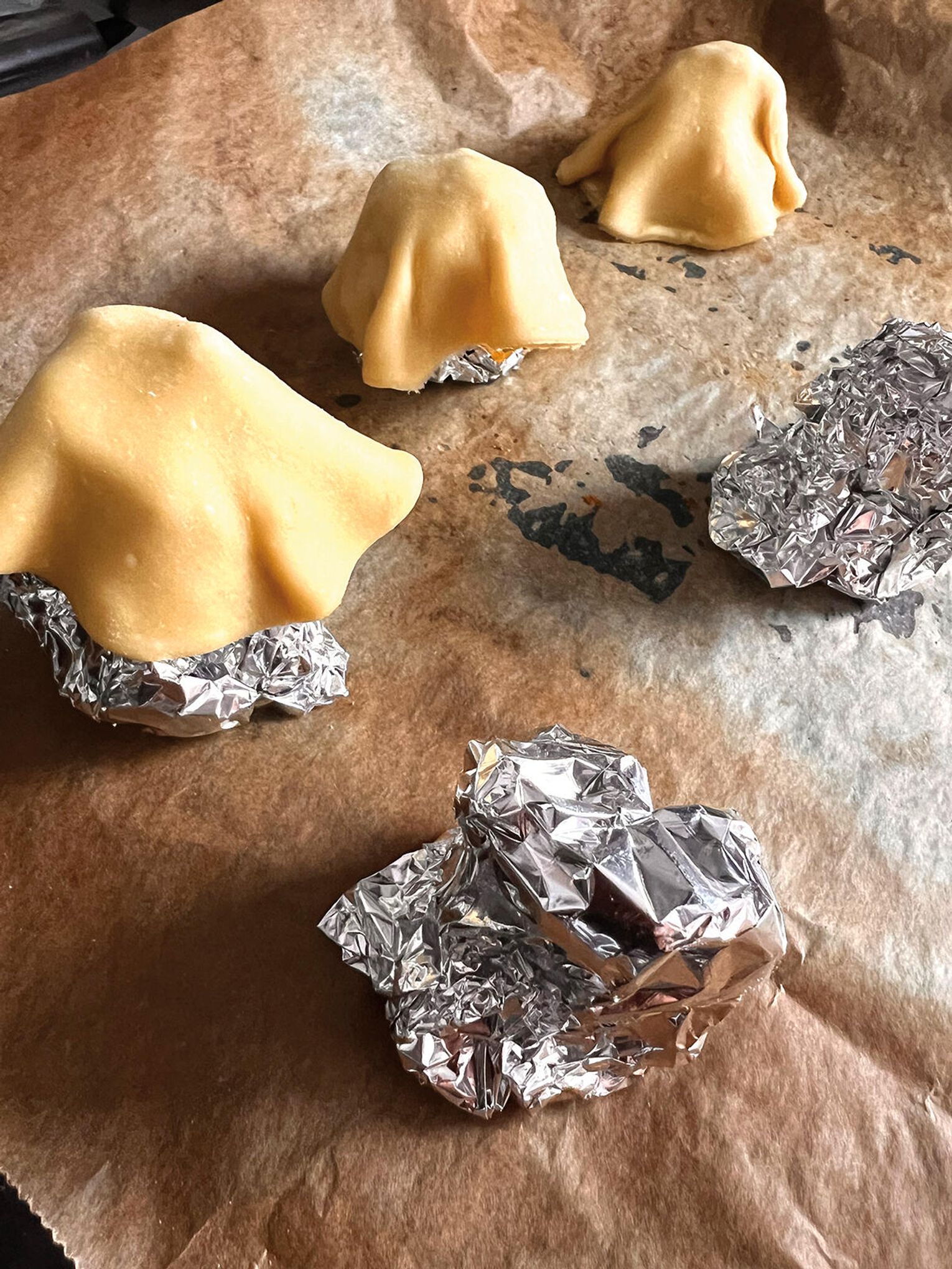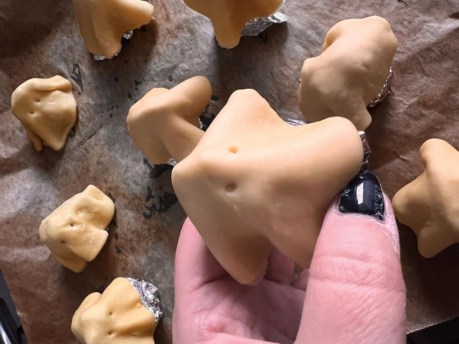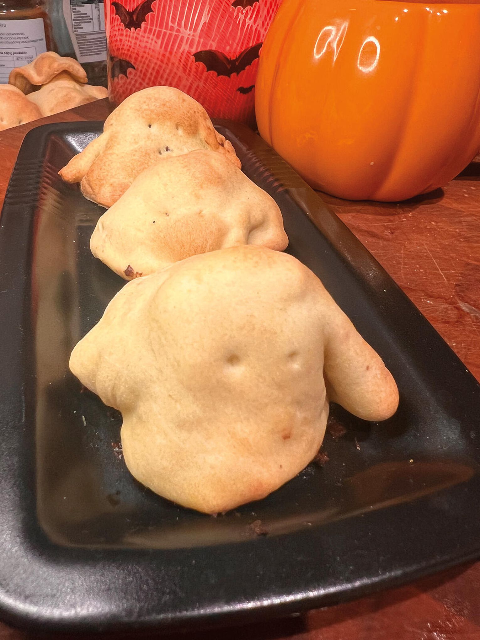 Ciasto rozwałkuj cienko i wytnij krążki (ok. 4 cale). Ułóż je na stożkach zrobionych z folii aluminiowej. Zrób dwa małe otworki wykałaczką – oczy. Piecz w 340°F (170°C) przez 10-12 minut (góra-dół), aż się lekko zarumienią. Gdy ostygną, zdejmij z foremek.