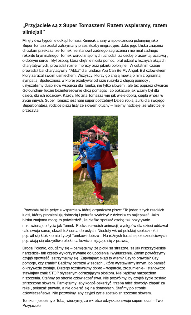 W mediach społecznościowych w halloweenowy weekend rozgorzała też dyskusja na temat zatrzymania przez służby imigracyjne ICE Tomasza Kmiecika, znanego w środowisku polonijnym jako Super Tomasz – nauczyciela tańca polonijnych przedszkolaków. Zwróciliśmy się do biura prasowego ICE z prośbą o szczegóły oraz powód tego zatrzymania, ale do czwartku, 6 listopada nie otrzymaliśmy odpowiedzi w tej sprawie. Według rejestru ICE Kmiecik znajduje się w ośrodku detencyjnym w El Paso w stanie Teksas.
