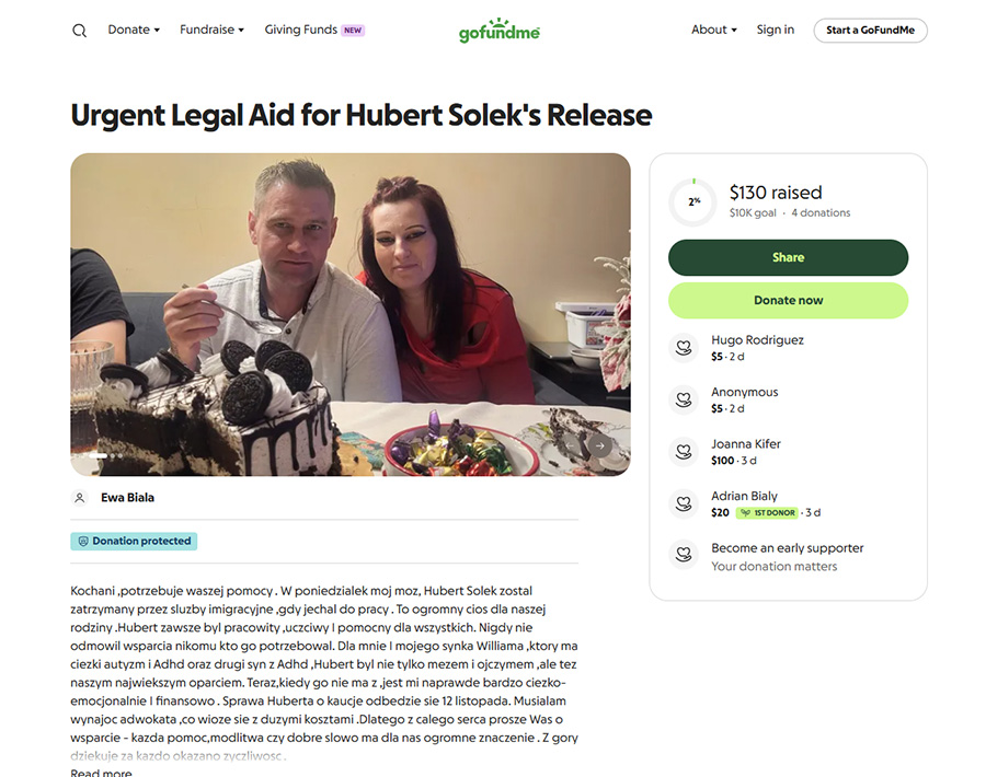 „To niezwykle trudna sytuacja – zarówno emocjonalnie, jak i finansowo” – czytamy w opisie zbiórki na GoFundMe. Organizator apeluje o środki finansowe, które „pomogą Tomaszowi przejść przez ten trudny proces prawny i pokryć niezbędne koszty związane z jego sytuacją osobistą i imigracyjną”. Do czwartku, 6 listopada zabrano ponad 9 tys. dolarów z docelowych 30 tysięcy dolarów.
